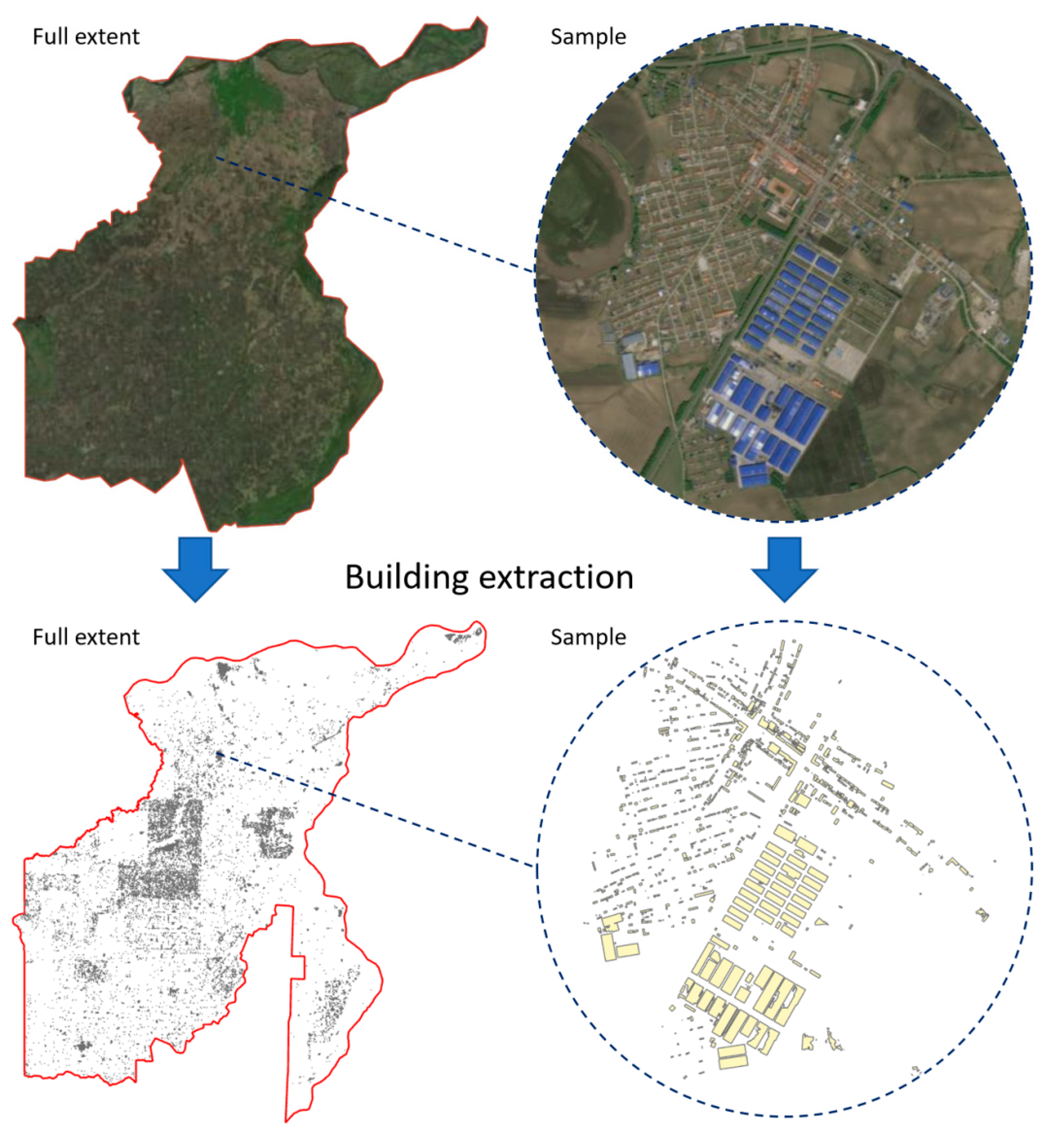 2.4. Remote-Sensing-Based Building Extraction and Building Area Estimation
