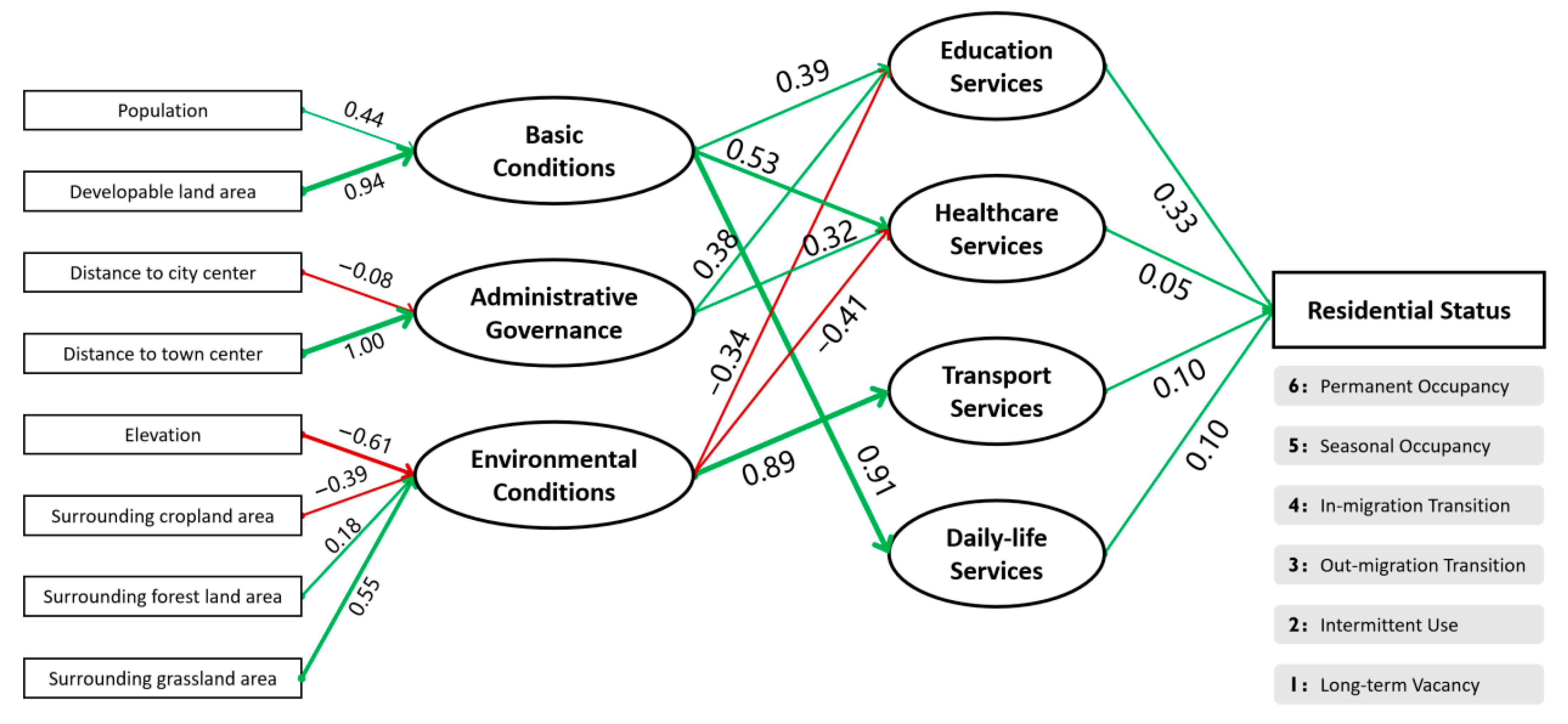The structural model specifies directional relationships from development, governance, and environment to residence stability, while explicitly modeling service accessibility as a mediator across four domains: education, healthcare, transport-related services, and daily life services. In this design, direct effects represent the net association between contextual conditions and residence stability, whereas indirect effects represent service-mediated pathways that translate broader conditions into household-level occupancy outcomes. The dependent variable was derived from the six occupancy trajectories identified in