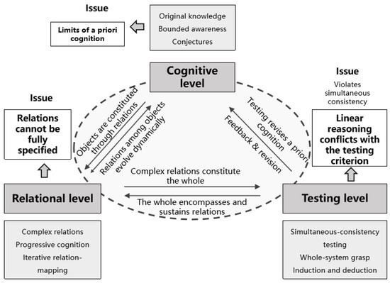 Holism conceptualizes analysis as a three-level process: a cognitive level concerned with understanding objective objects, a relational level concerned with relationships among elements, and a testing level concerned with examining the coherence of the entire relational system among objects. In this study, we summarize holism as a three-level process—the three-level process of cognition–relation–testing—and its iterative cycle. The cognitive level establishes an initial judgment about the object of analysis; the relational level maps the complex interconnections among elements on the basis of that initial cognition; and the testing level examines the consistency of the judgments and relational structure produced by the first two levels and, where necessary, feeds back to revise them [7,8] (Figure 1). Importantly, the “whole” is not the simple sum of its parts; it is generated by the configuration of relational structures. Likewise, the three levels do not end in a linear sequence. Instead, they are continuously recalibrated through an iterative loop of “testing–feedback–re-cognition/re-organization.”