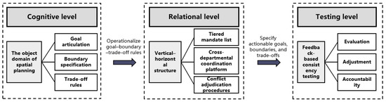 To prevent holism from remaining at an abstract conceptual level, we further operationalize it as a three-level governance chain—the three-level process of cognition–relation–testing—for territorial spatial planning analysis. The cognitive level concerns how spatial values and governance goals are articulated and bounded; the relational level concerns the allocation of authority and responsibilities, coordination mechanisms, and conflict-adjudication procedures across multiple levels, departments, and actors; and the testing level examines whether land-use control, indicator-based constraints, monitoring and evaluation, feedback adjustment, and accountability incentives together constitute an institutional closed loop. The three levels should not be understood as linear steps, but as an iterative “testing–feedback–re-cognition/re-organization” cycle, designed to avoid replacing holistic consistency checks with piecemeal, linear aggregation (Figure 1).