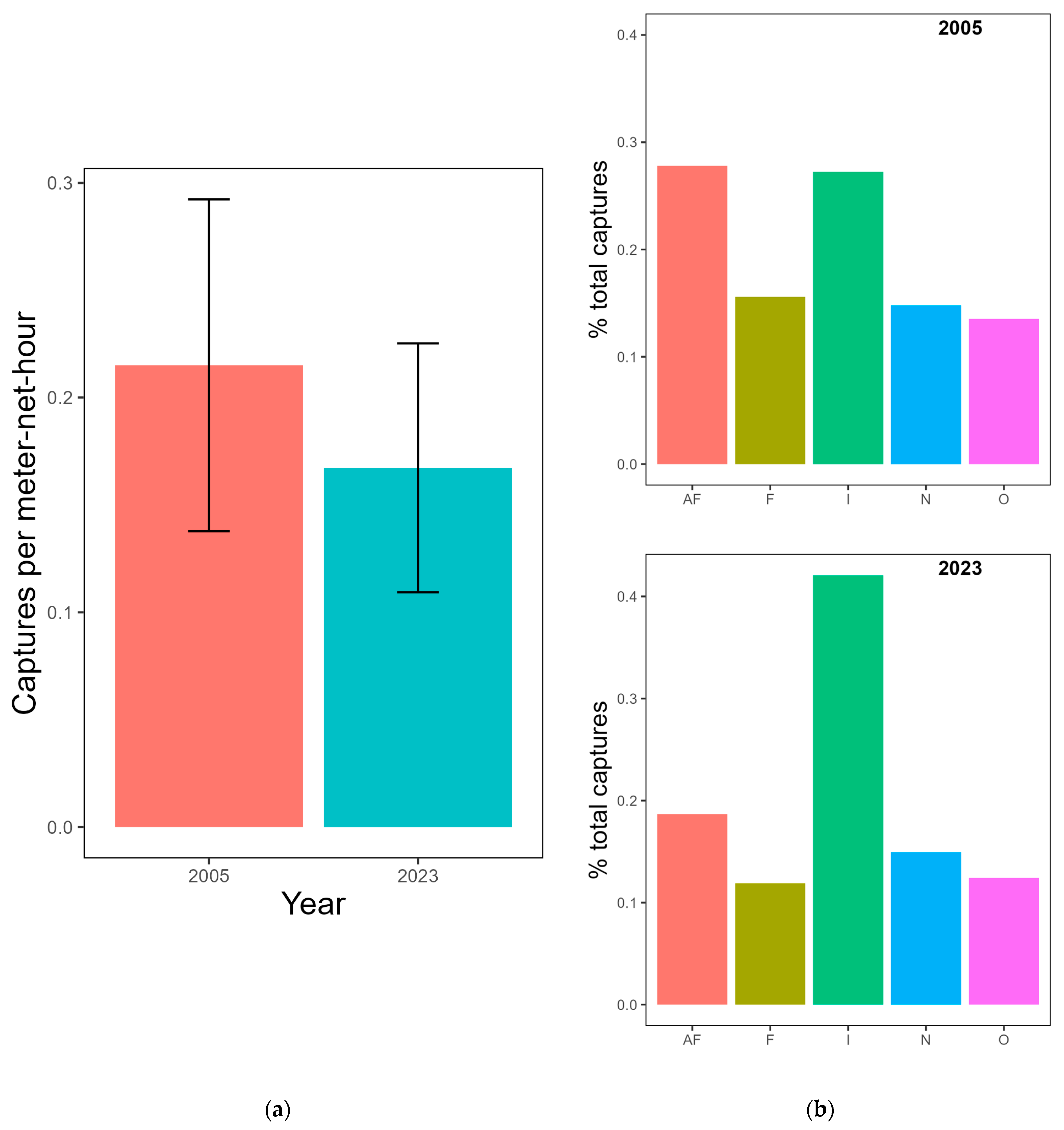 - Remsen, J.V., Jr.; Good, D.A. Misuse of data from mist-net captures to assess relative abundance in bird populations. Auk 1996, 113, 381–398. [Google Scholar] [CrossRef]