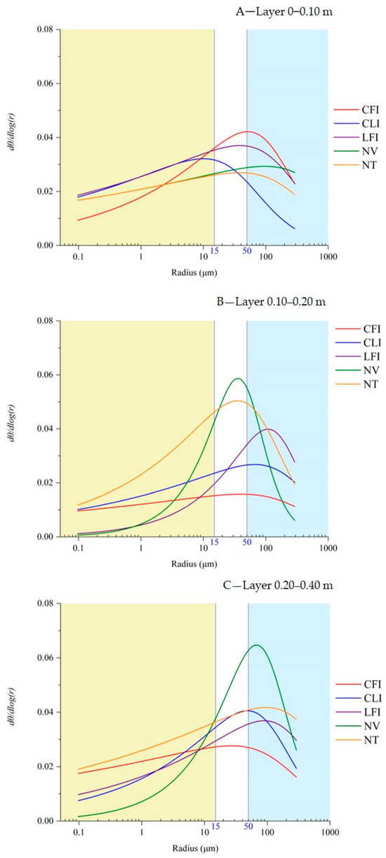 The frequency curves of pore radii per log(r) interval, derived from the soil water retention curves for the studied management systems and soil layers, enabled the separation of pore classes (macro-, meso-, and micropores) (Figure 4A–C). The yellow band of the graph represents the frequency of micropores (r < 15 µm), the white band represents mesopores (15 < r < 50 µm), and the blue band represents macropores (r > 50 µm).