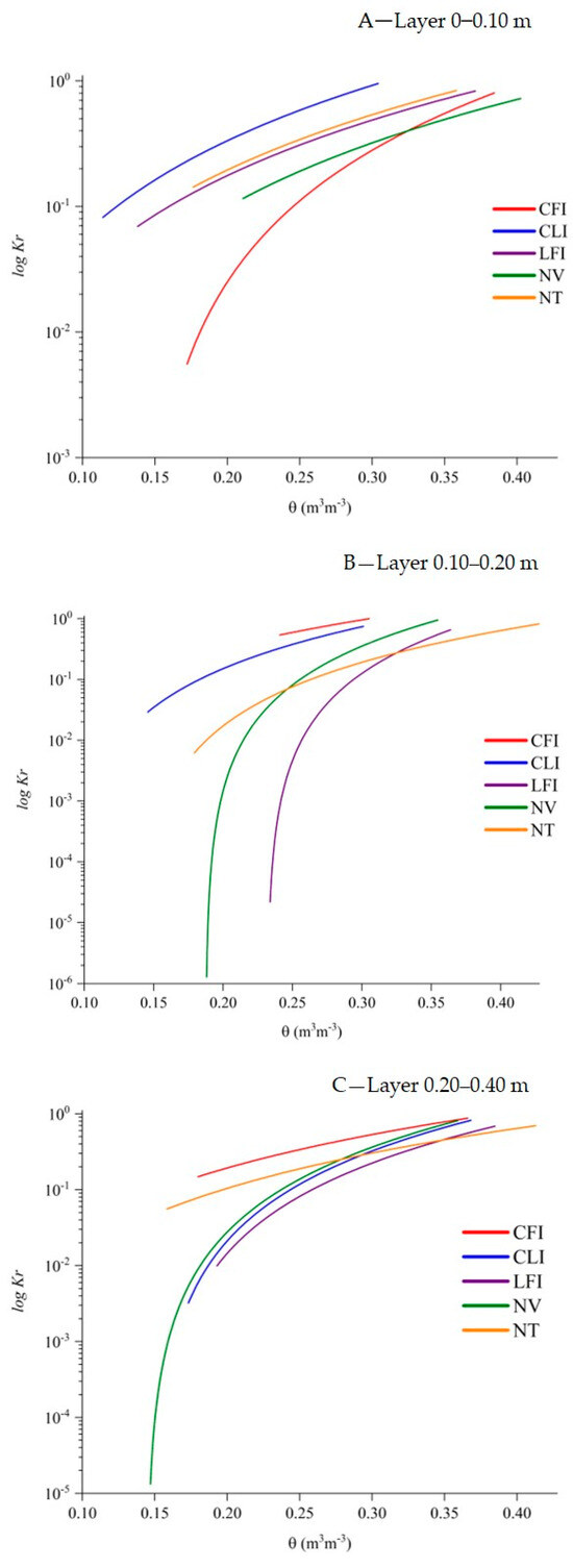 In the surface layer (0.00–0.10 m), the CFI system (Figure 5A) showed the greatest variation in log Kr, indicating more dynamic water movement, with higher values at greater water contents (macropores and mesopores) and a sharp decrease as the soil dried. However, in the subsequent layer (0.10–0.20 m), the CFI and CLI systems (Figure 5B) exhibited curves with little variation in log Kr, whereas the NT, NV, and LFI systems showed curves with a rapid decrease in log Kr as water content declined. In the 0.20–0.40 m layer (Figure 5C), the CFI and NT systems displayed more horizontal log Kr curves, indicating slower pore drainage, while the NV, CLI, and LFI systems showed a more rapid reduction in Kr over the analyzed water content range.