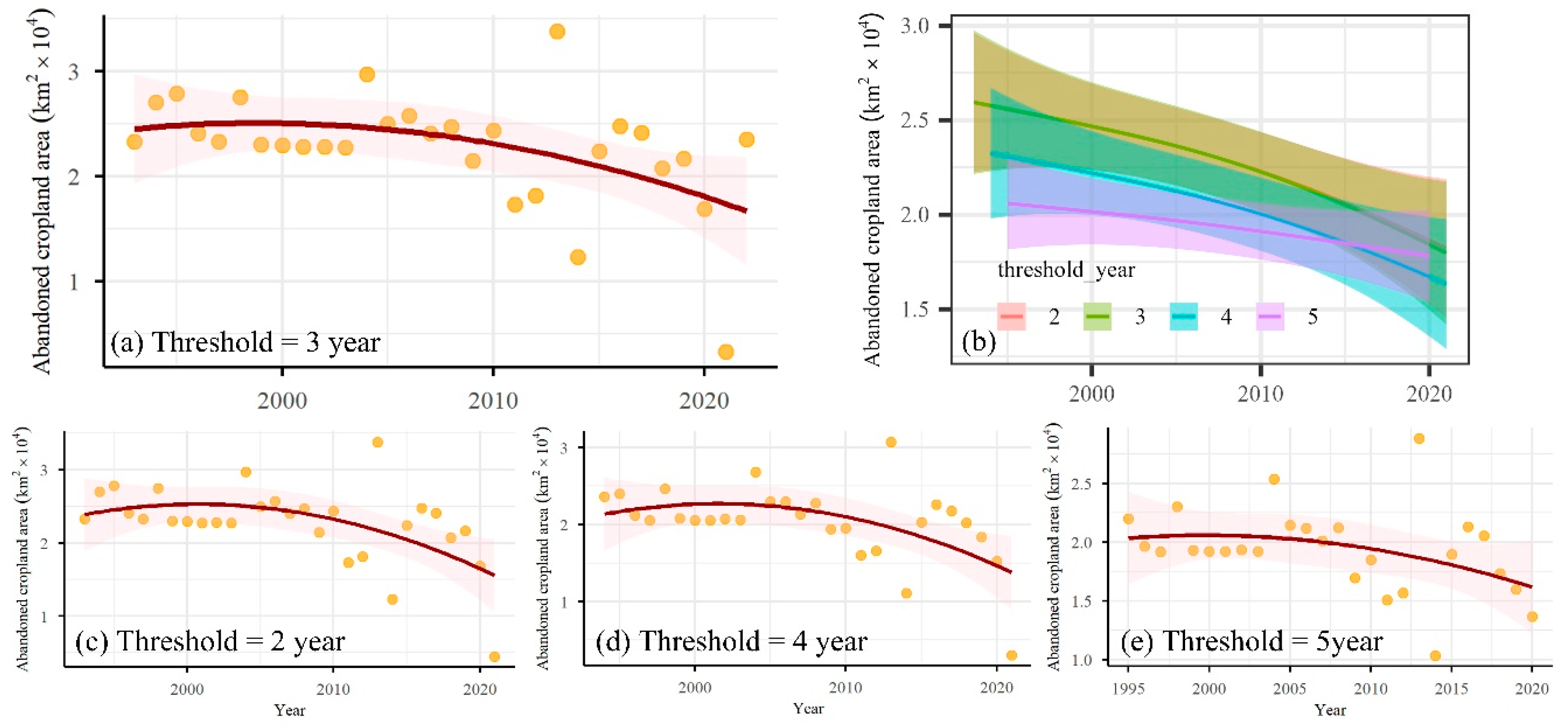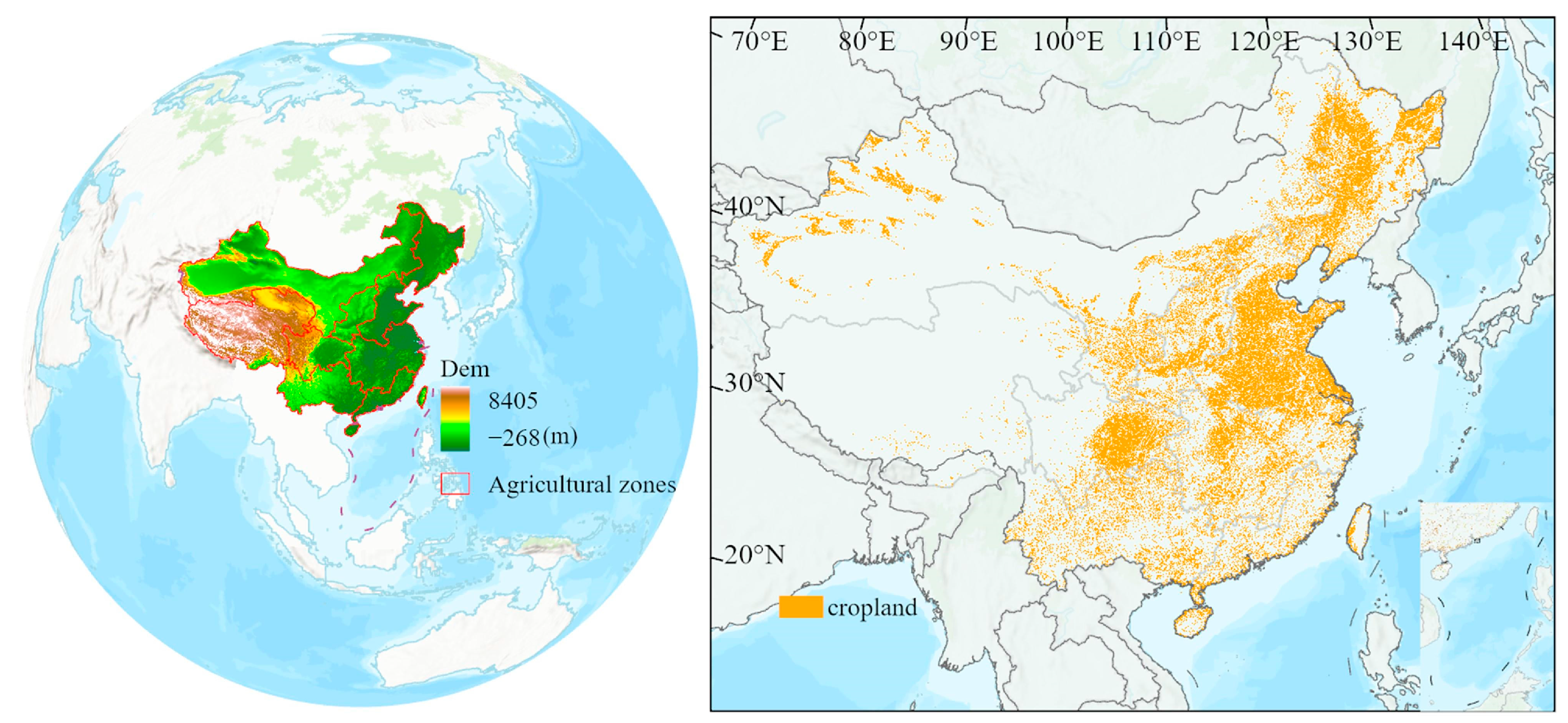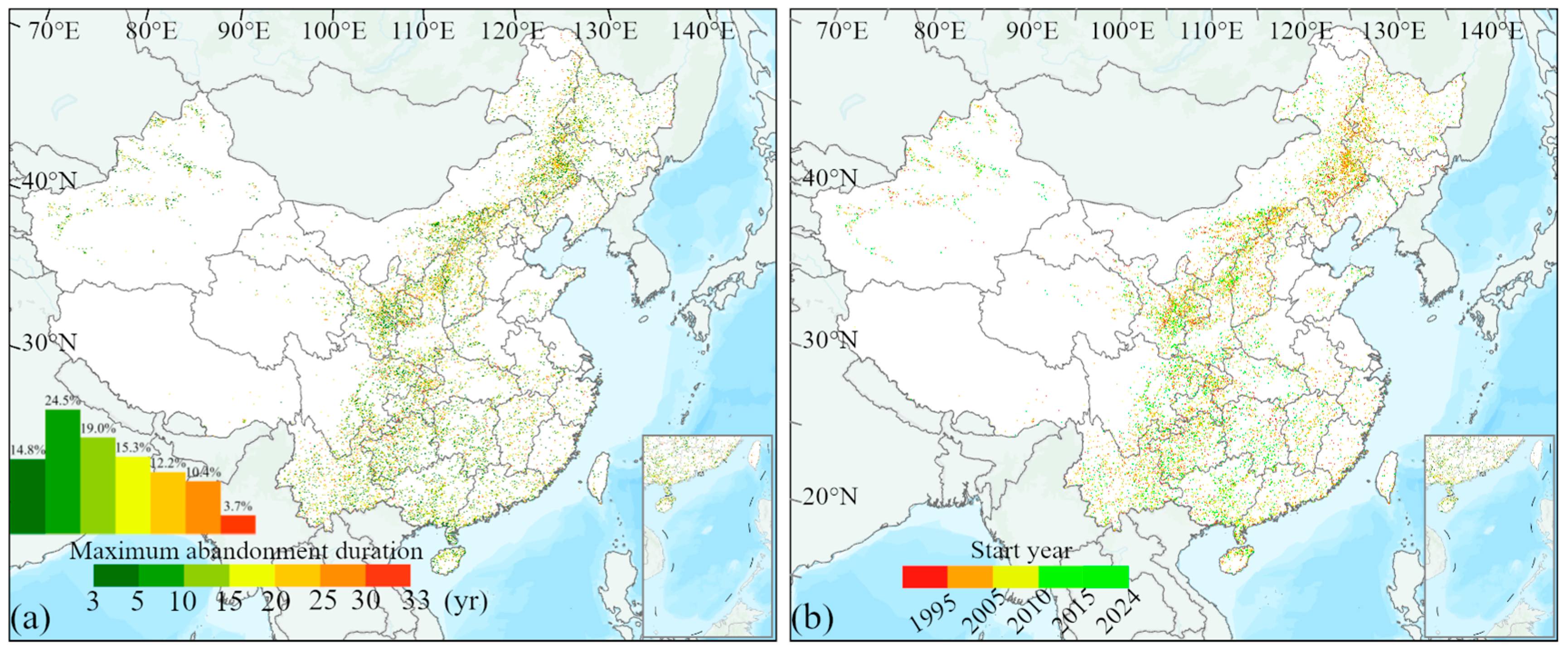 - Wang, H.; Guo, Z.; Xie, Y.; Zhang, X.; Xi, G.; Huang, H. Is Abandoned Cropland Continuously Growing in China? Quantitative Evidence and Enlightenment from Landsat-Derived Annual China Land Cover Dataset. Land 2023, 13, 45. [Google Scholar] [CrossRef]