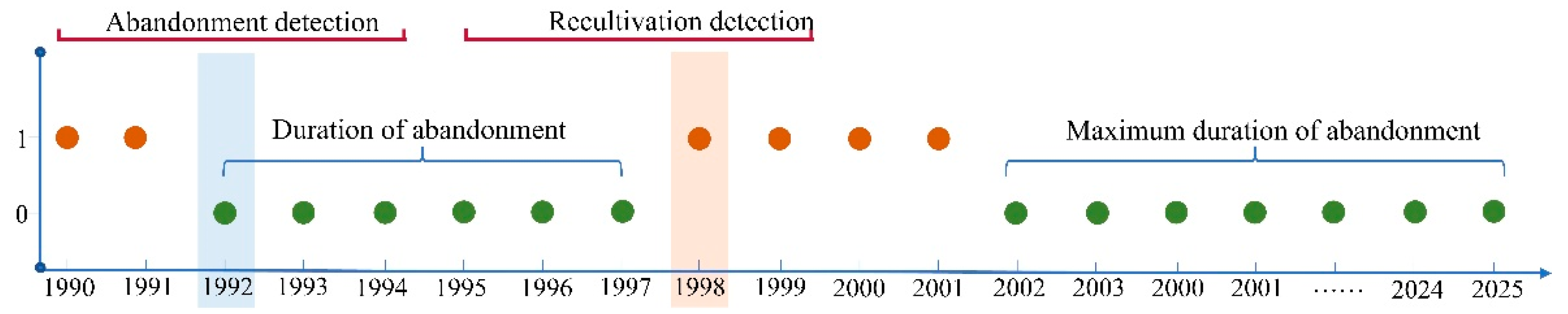 - Liu, T.; Yu, L.; Liu, X.; Peng, D.; Chen, X.; Du, Z.; Tu, Y.; Wu, H.; Zhao, Q. A Global Review of Monitoring Cropland Abandonment Using Remote Sensing: Temporal–Spatial Patterns, Causes, Ecological Effects, and Future Prospects. J. Remote Sens. 2025, 5, 0584. [Google Scholar] [CrossRef]