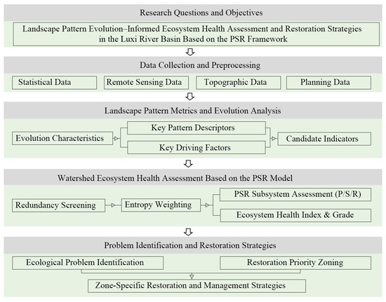 However, a practical challenge in applying the PSR framework to complex, urbanizing watersheds lies in indicator-system construction. Many existing studies still rely heavily on literature synthesis and expert judgment for indicator selection and weighting, which can introduce substantial subjectivity and limited data-driven support; consequently, the resulting indicator systems may not fully capture the differentiated characteristics and dominant processes of specific regions [29,30,31,32]. Land-use/land-cover change (LULCC) and the associated evolution of landscape patterns are widely recognized as primary drivers of watershed ecological processes and key pathways of ecological functional degradation [33]. From a theoretical perspective, landscape-pattern evolution should be treated not merely as a descriptive outcome, but as a spatially explicit and process-oriented proxy that links anthropogenic land transformation to ecosystem-function dynamics. Yet, in many assessments, landscape-pattern information remains largely descriptive or correlation-oriented, and has not been sufficiently operationalized into process-relevant evidence for indicator development, data-driven screening, and mechanism interpretation [34,35,36]. For rapidly urbanizing basins such as the Luxi River, remotely sensed landscape metrics provide objective signals of fragmentation, dominance shifts, diversity dynamics, and connectivity alteration [37,38,39]. Recent empirical studies in metropolitan regions further demonstrate that landscape structure is dynamically coupled with ecosystem services, and that landscape-pattern–ecosystem-health relationships vary with urbanization stages and spatial heterogeneity [40,41]. Therefore, using observed landscape-pattern evolution as an empirical basis to identify sensitive landscape descriptors and related driving factors can strengthen PSR indicator construction, improve regional specificity and interpretability, and reduce arbitrariness.