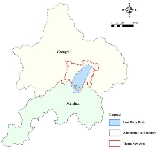 As one of the major river systems in the directly administered area of Tianfu New Area, the Luxi River is a crucial water source for Xinglong Lake and a first-order tributary of the Jinjiang River, which is itself a tributary of the Minjiang River. The river is 74.6 km long, and the basin covers approximately 697 km2, covering 17 township-level administrative units (Figure 4). Runoff is primarily generated from precipitation in the Longquan Mountains, and the hydrograph is characterized by rapid rises and falls. The maximum flood discharge reaches approximately 1340 m3/s, whereas the minimum dry-season flow is approximately 0.02 m3/s, with a multi-year mean flow of approximately 5.72 m3/s. Baseflow is relatively low, and self-purification capacity is limited. Coupled with lagging rural sewage treatment and agricultural nonpoint source pollution, river water quality in the basin has long remained at Grade V under national surface-water standards.