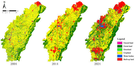 Land-use classification of the Luxi River Basin (2004, 2014, and 2024).