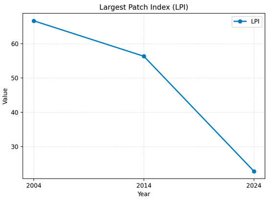 Temporally (Figure 10), the LPI declined from 66.71 in 2004 to 56.36 in 2014, followed by a sharp decrease to 22.79 in 2024. The marked decline after 2014 indicates that the largest land-cover patch became increasingly dissected, leading to a substantial loss of dominance and continuity across the basin.