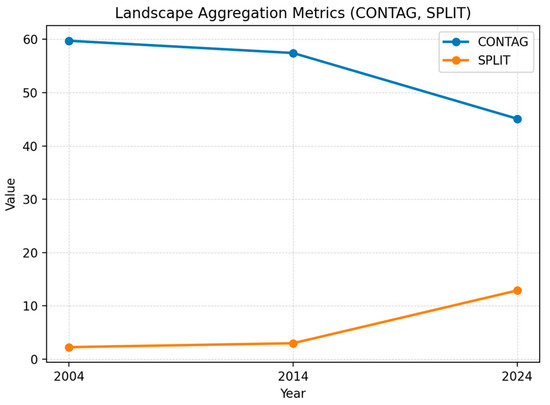 - Aggregation–division dimension. The contagion index (CONTAG) and the splitting index (SPLIT) quantify complementary aspects of landscape structure—clumping/connectivity versus division intensity. CONTAG and SPLIT emphasize different mechanisms and are not redundant; thus, both were retained.
