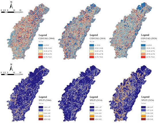 Spatially (Figure 9), the eastern part of the basin showed minor changes and maintained a more stable landscape configuration, whereas the central and southern areas exhibited stronger dynamics. In 2004, moderately high to high values of LSI and PD were observed as scattered spots and patches, indicating localized fragmentation. By 2014, areas with moderately high to high LSI and PD contracted, while low-value areas expanded. Meanwhile, zones with high AREA_MN became highly concentrated, implying a temporary reduction in fragmentation and improved patch contiguity. By 2024, areas with high LSI and PD expanded markedly, while areas with low AREA_MN increased. This phenomenon indicates that recent land conversion and construction further dissected patches, increased shape complexity, and reinforced fragmentation, particularly in the central and southern basin.