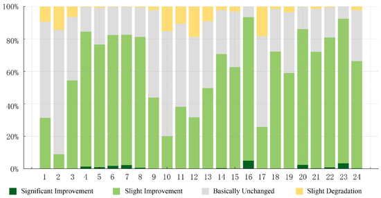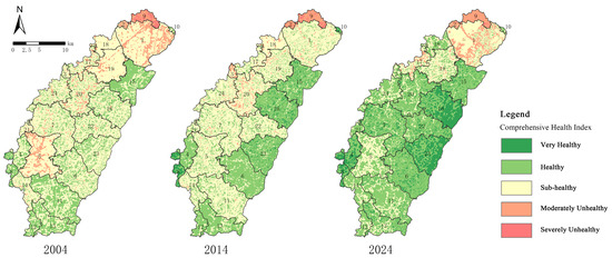 For health-grade classification, the computed EHI values were linearly rescaled to [0, 1] and then classified into five fixed equal-interval classes: [0.0, 0.2), [0.2, 0.4), [0.4, 0.6), [0.6, 0.8), and [0.8, 1.0] (Table 8). This strategy was adopted for three reasons: (1) EHI is a normalized proportional index and is suitable for equal-interval classification; (2) fixed thresholds prevent year-specific breakpoint drift in multi-temporal comparisons and thus improve cross-year comparability; and (3) this grading strategy is commonly used in ecosystem health assessment, facilitating interpretation and comparison across studies [42,43].