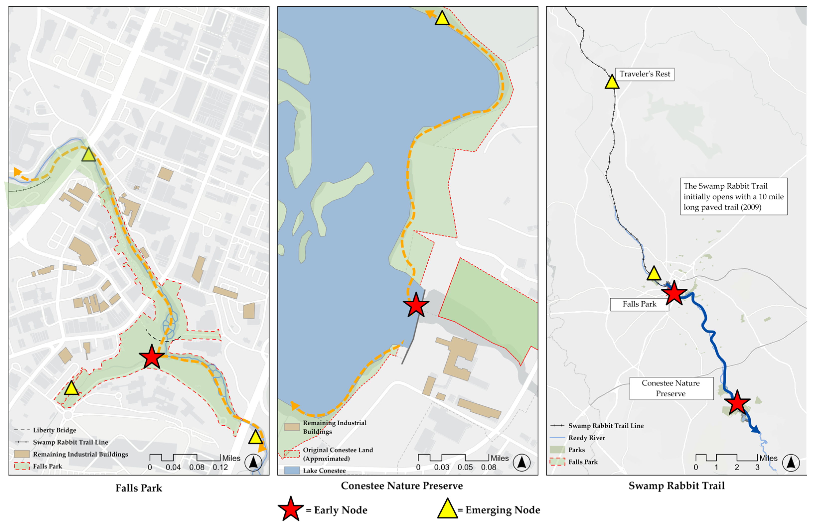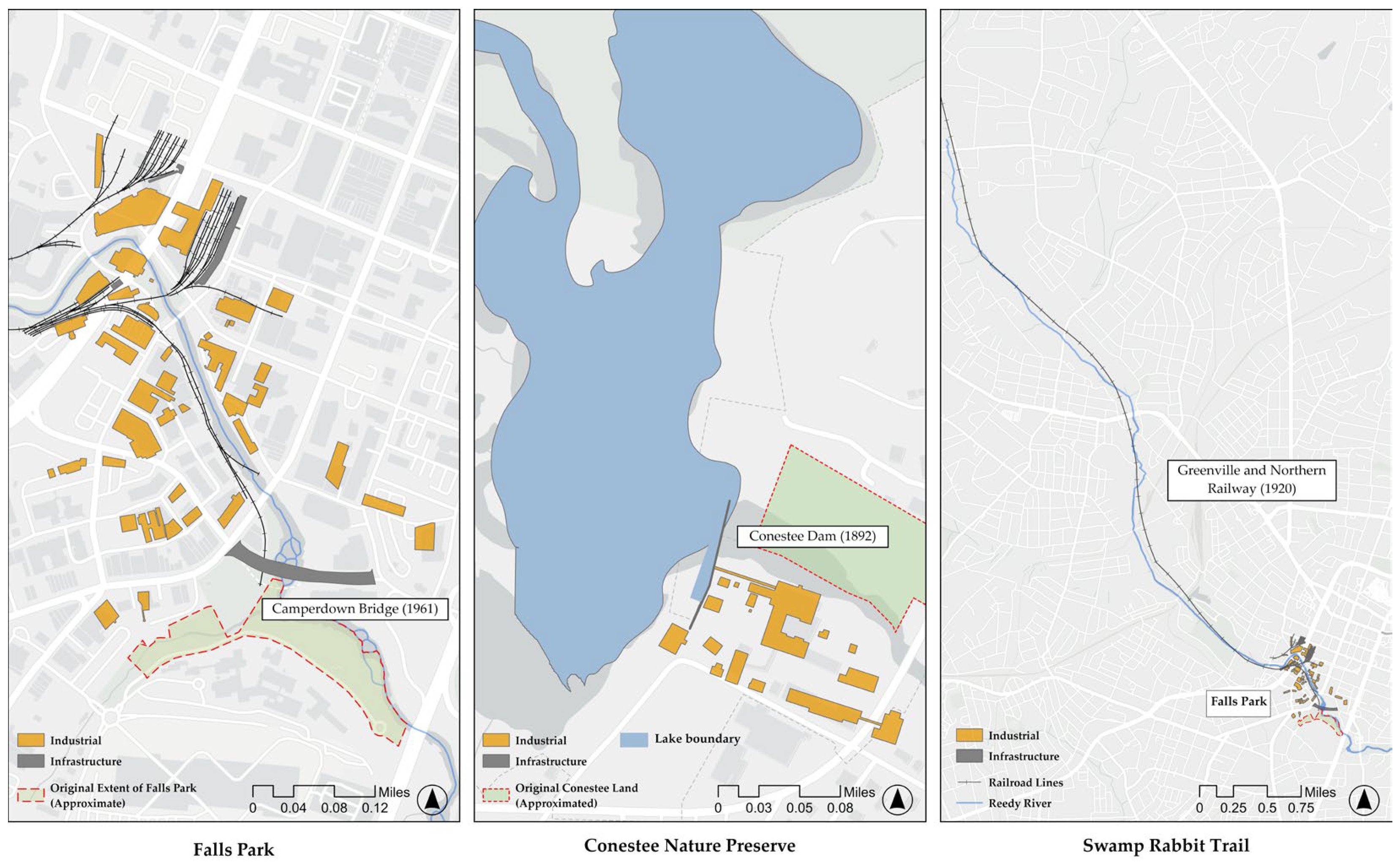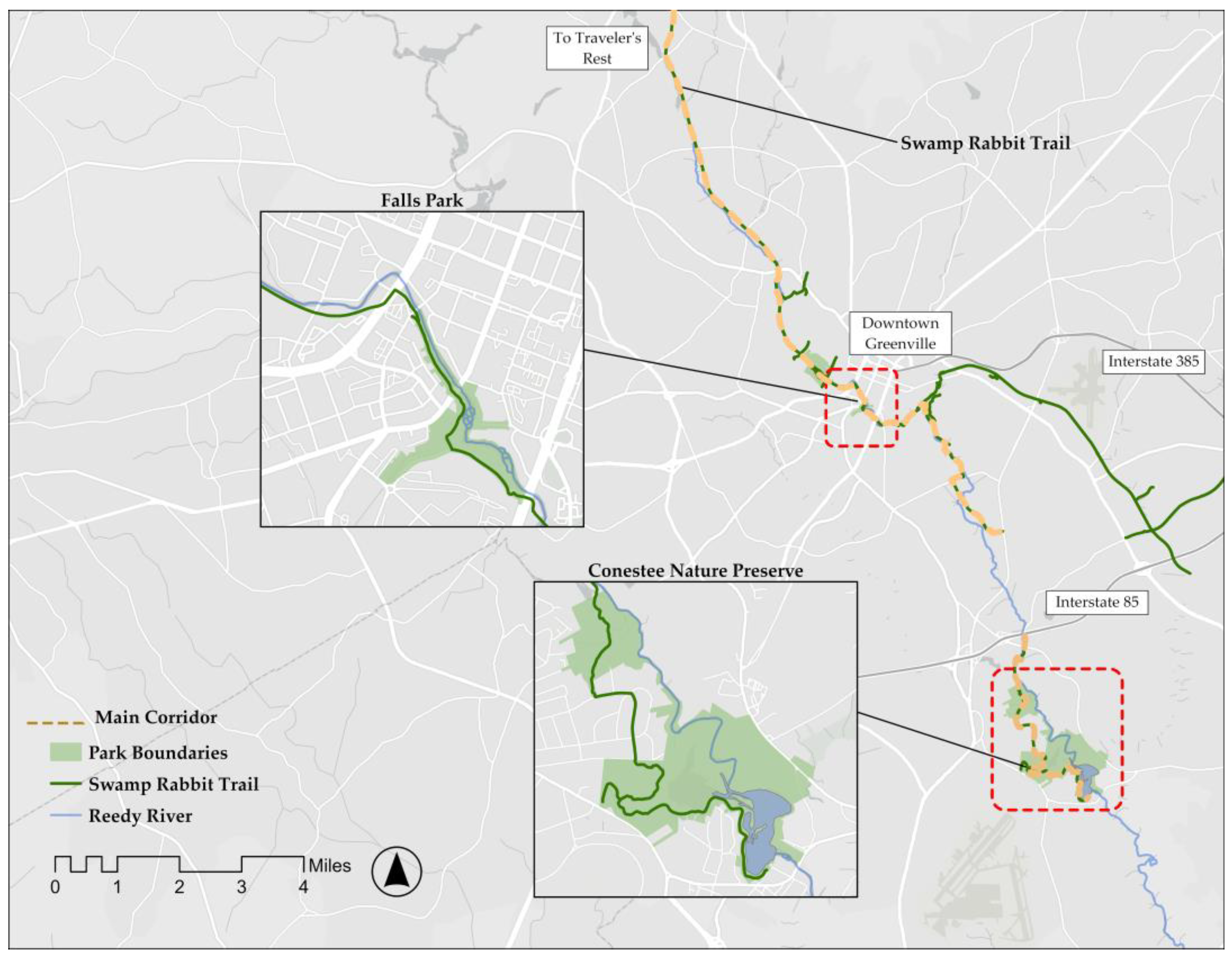 Three interconnected case studies in Greenville, South Carolina; Falls Park on the Reedy, Conestee Nature Preserve, and the Swamp Rabbit Trail, were selected through purposive sampling based on their shared industrial origins, spatial proximity, and functional interdependence within a broader greenway system. Together, they represent distinct typologies of parkification while remaining embedded within a single regional context.