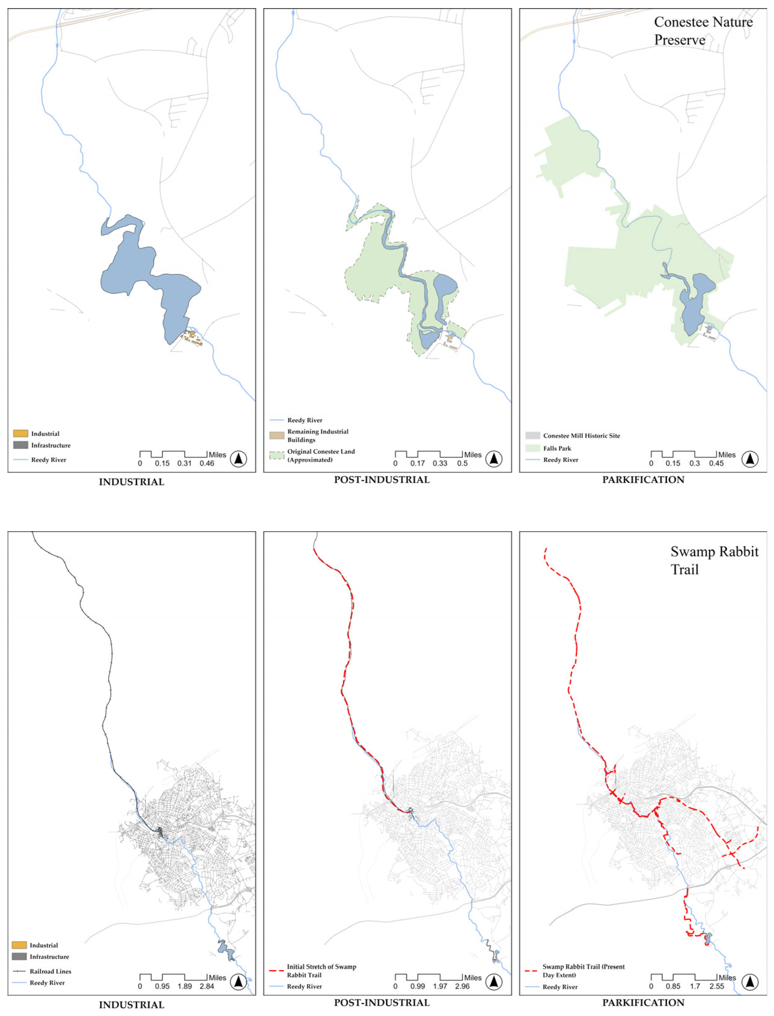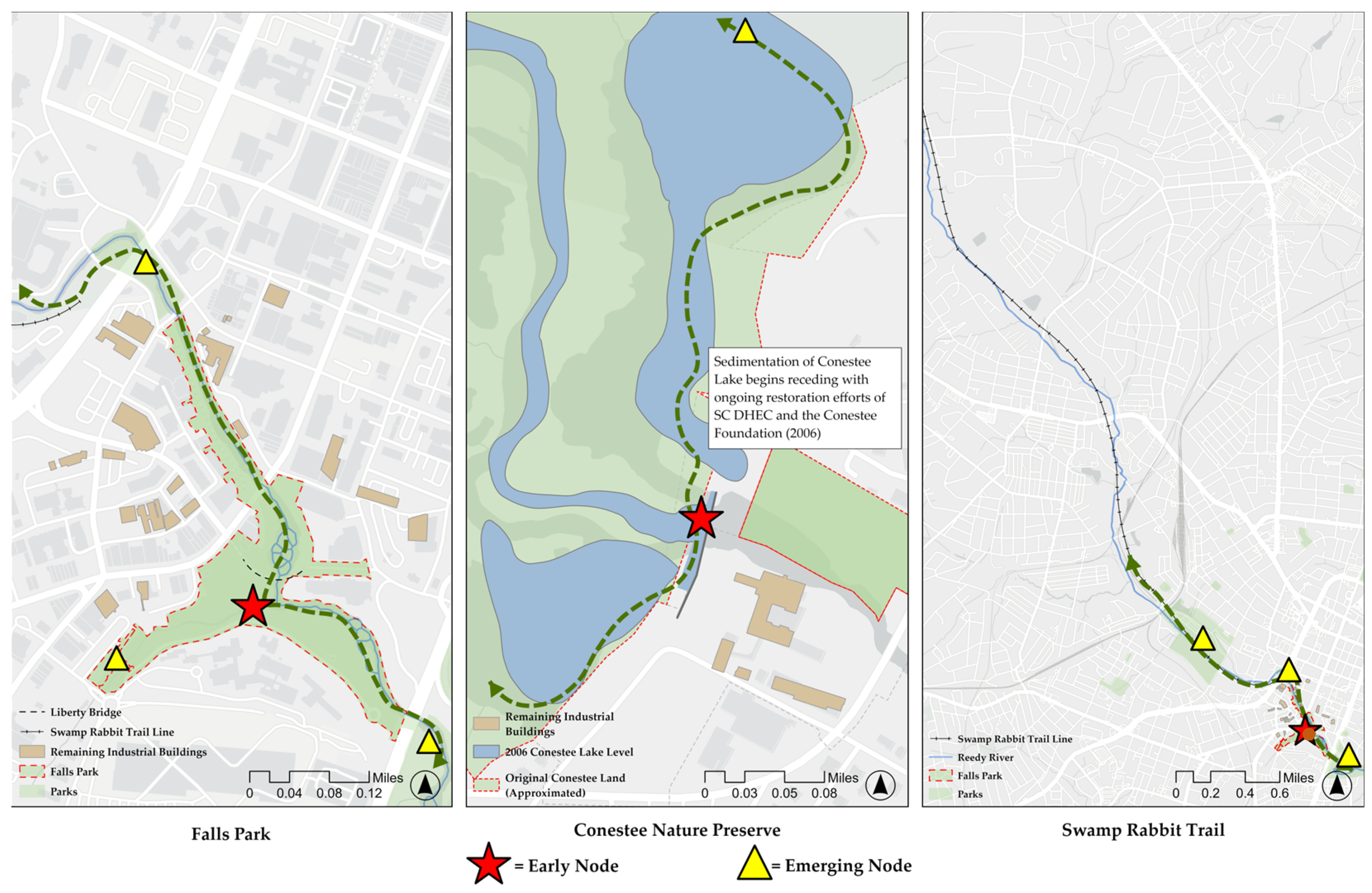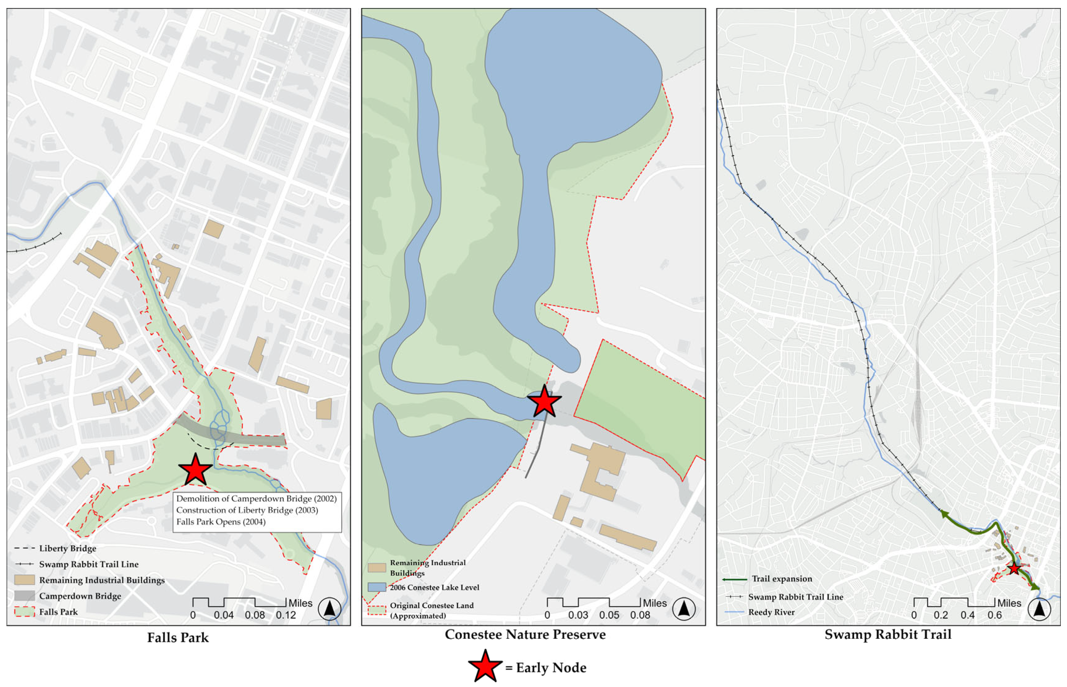 16]. Following the opening of Falls Park on the Reedy in the early 2000s, Greenville experienced a gradual sequence of landscape-led interventions rather than an immediate wave of park development. Subsequent projects unfolded over two decades and across different contexts, including Conestee Nature Preserve downstream within the Reedy River watershed, later additions such as Unity Park along the Reedy corridor, and the incremental expansion of the Swamp Rabbit Trail along former rail alignments. Together, these projects illustrate a staggered and cumulative pattern of parkification, with the most recent mill-related park opening in 2022. Notably, the success and visibility of early projects appear to have influenced subsequent investments, suggesting a cumulative pattern of landscape transformation.