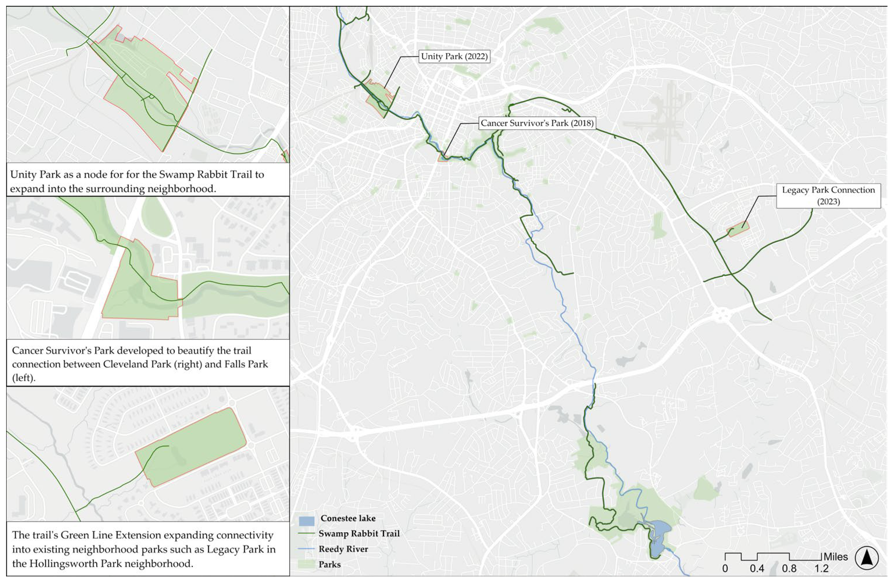 Mapping of trail extensions over time shows how the Swamp Rabbit Trail functions as a connective spine linking multiple parkification nodes, including Falls Park and Conestee Nature Preserve, while extending north toward Travelers Rest and south along the Reedy River corridor,