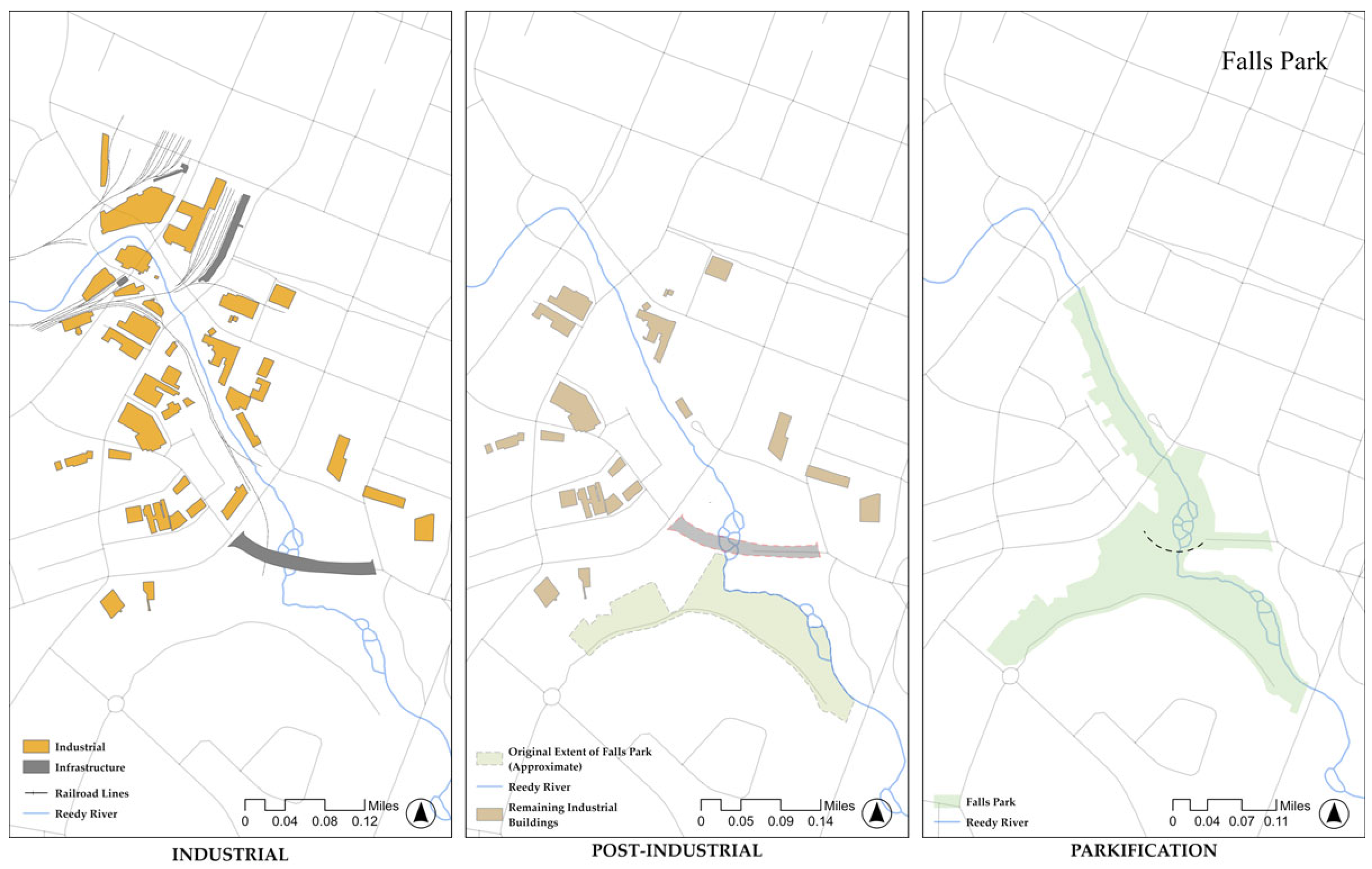 The study is situated in Greenville in the Upper State region of South Carolina, an area whose landscape has been profoundly shaped by industrialization, water infrastructure, and rail-based production systems. Beginning in the late eighteenth century and accelerating through the nineteenth and early twentieth centuries, Greenville developed as a mill-centered economy organized around the Reedy River and its tributaries. Textile mills, dams, mill ponds, and rail corridors formed a tightly coupled industrial landscape that structured patterns of settlement, labor, and environmental modification. As manufacturing declined in the mid- to late twentieth century, many of these sites were abandoned or underutilized, leaving behind environmentally compromised lands, disrupted hydrological systems, and fragmented open space.