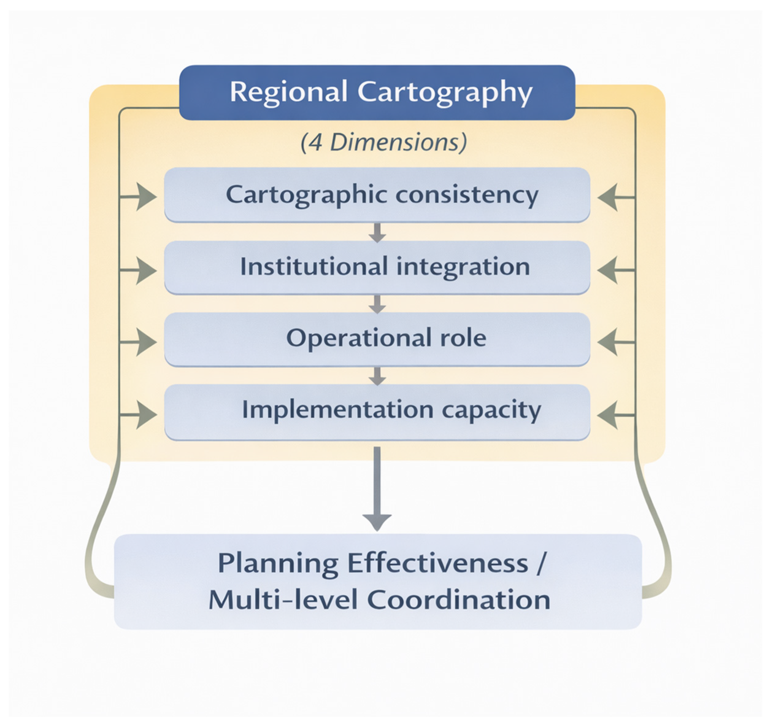 The analysis is structured around an analytical framework that conceptualizes regional cartography as a structural component of spatial planning systems rather than as a purely representational or technical output. The framework comprises four interrelated dimensions: