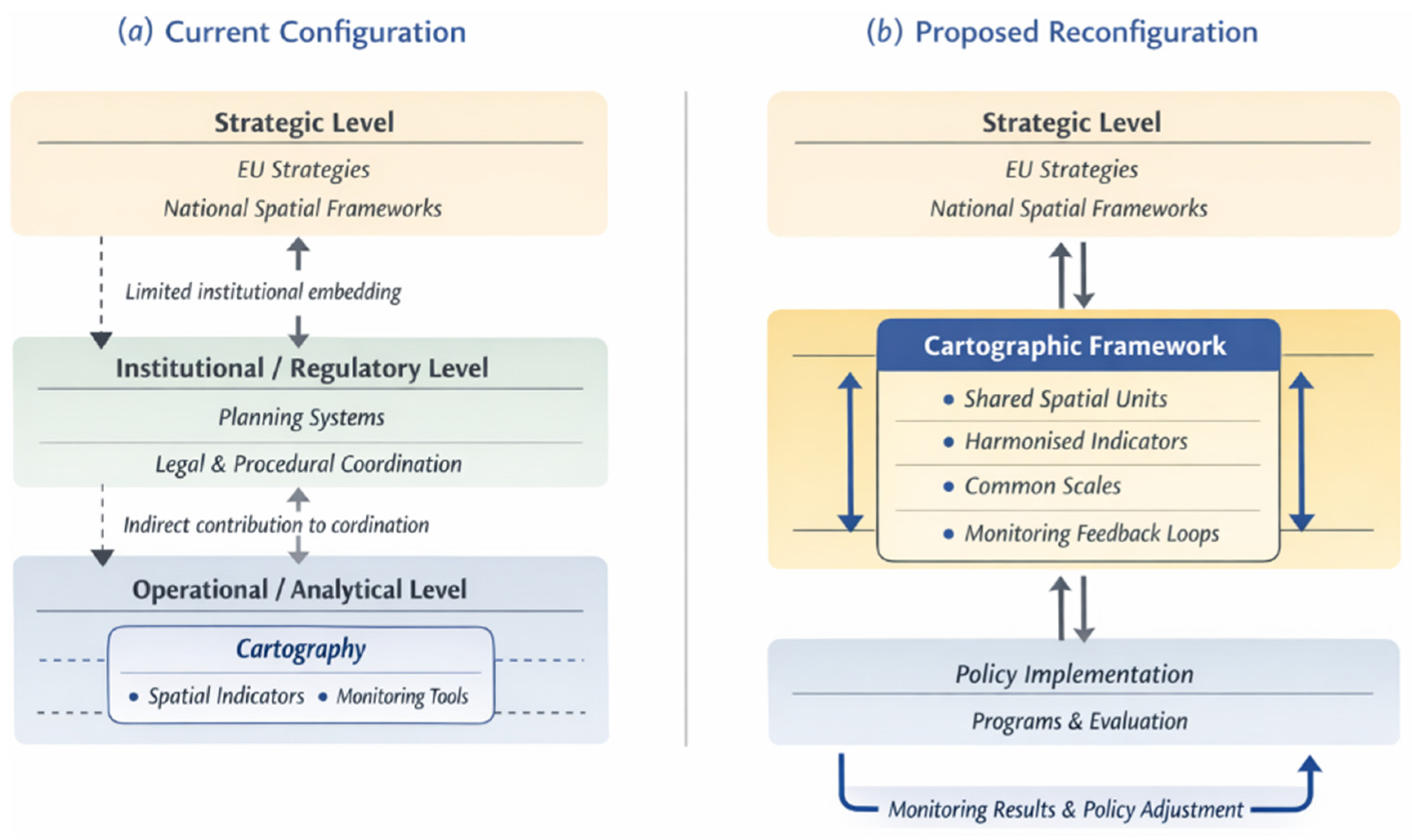 Figure 2b builds directly on these insights. Rather than treating cartography as a downstream technical output, the figure conceptualizes cartographic frameworks as an intermediary planning infrastructure linking strategic objectives, institutional coordination, and policy implementation. In this configuration, shared spatial units, harmonized indicators, and common cartographic scales function as structural elements that translate strategic priorities into operational and evaluative processes. Importantly, the inclusion of monitoring feedback loops highlights how cartographic frameworks can support iterative policy adjustment, thereby strengthening the connection between planning objectives and implementation outcomes.