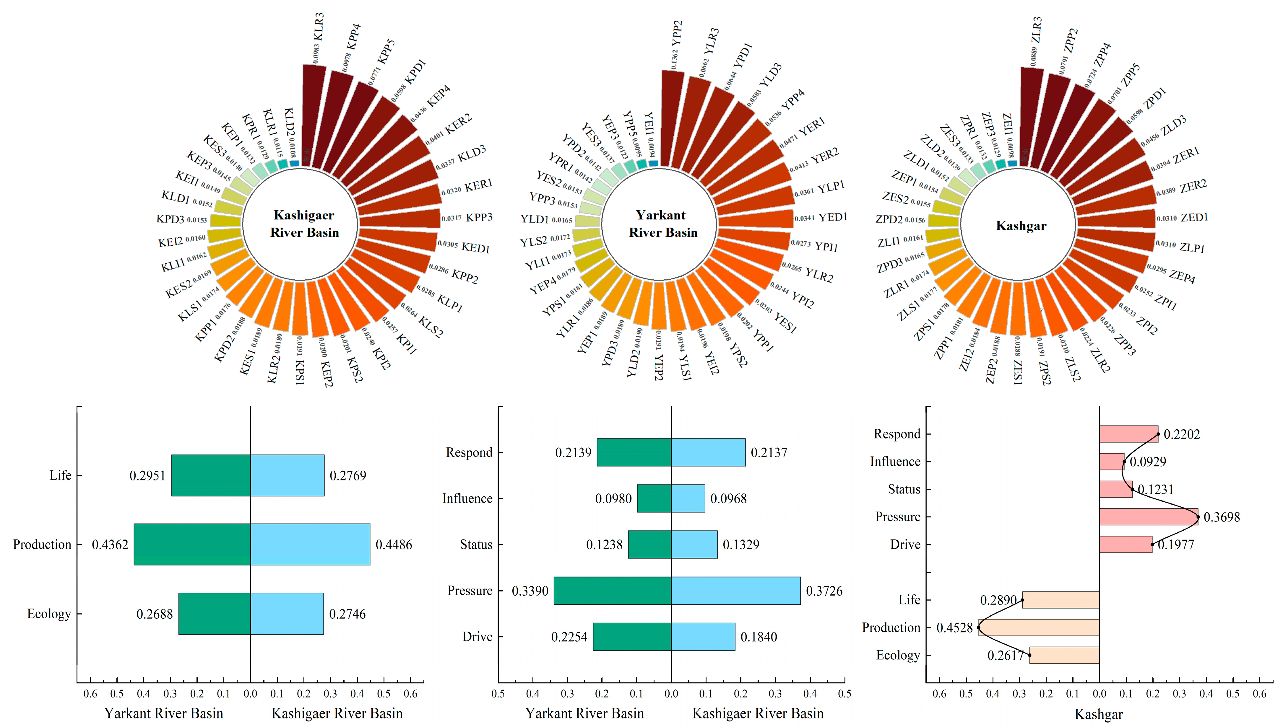 Figure 2, the results showed that the main influence factors in Yarkant River Basin were industrial water use (YPP2) 0.1362, wastewater treatment and reuse (YLR3) 0.0662, livestock (YPD1) 0.0644, with a total weight of 26.67%; the secondary influencing factors were forest land (YEI1) 0.0094, pesticide use (YPP5) 0.0095, and groundwater source supply (YEP3) 0.0123, with a total weight of 3.12%. The main factors in the Kashigaer River Basin are sewage treatment reuse (KLR3) 0.0983, agricultural diesel use (KPP4) 0.0978, and pesticide use (KPP5) 0.0771, with a total weight of 27.33%; and the secondary influencing factors are gross domestic product (KLD2) 0.0108, land for watersheds and water conservancy facilities (KLR1) 0.0115, and highly efficient water-saving area (KPR1) 0.0129, with a total weight of 3.51%. The main factors in Kashgar Prefecture are sewage treatment and reuse (ZLR3) 0.0889, industrial water use (ZPP2) 0.0791, agricultural diesel use (ZPP4) 0.0724, with a total weight of 24.04%; the secondary factors are forest land (ZEI1) 0.0098, supply of groundwater sources (ZEP3) 0.0129, area of highly efficient water conservation (ZPR1) 0.0132, with a total weight of 3.59%. In summary, sewage reuse, industrial water use, and agricultural diesel use are the main factors affecting water ecological security in the three regions, while indicators such as forested land and groundwater source supply exhibit comparatively minimal impact.