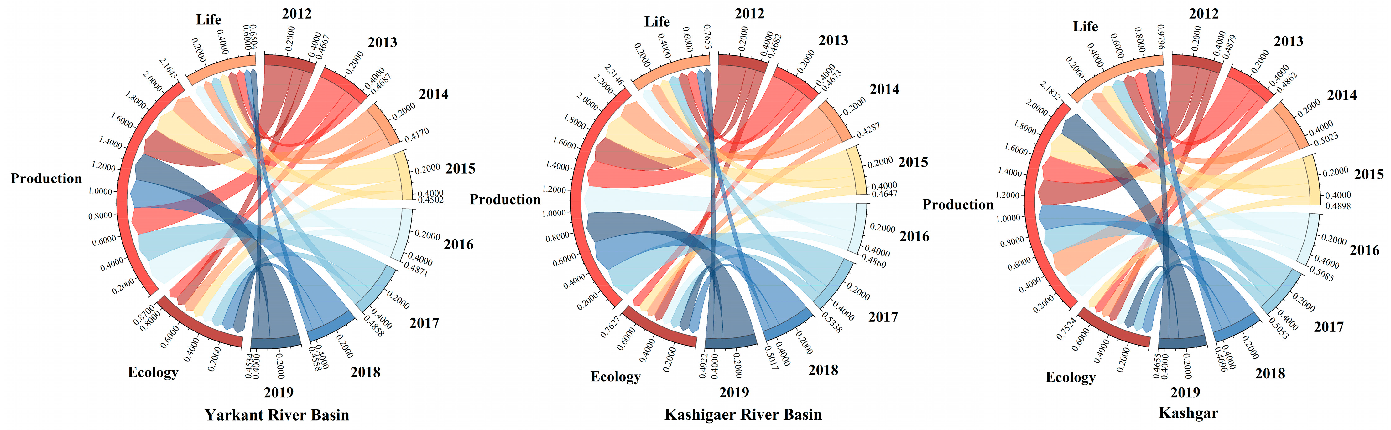 Figure 3, in the Yarkant River Basin, the ecological composite index showed a gentle upward trend from 2012 to 2019, gradually increasing from 0.0890 to 0.1008. Specifically, there was negligible change and only small fluctuations during 2012–2015; it increased annually to the highest value of 0.1021 from 2015–2018, and then slightly decreased in 2019; the production composite index showed an overall gentle trend during this period, decreasing from 0.2711 in 2012 with small fluctuations to 0.2677 in 2019; the living index showed an overall flat trend during this period, decreasing from 0.2711 in 2012 with small fluctuations to 0.2677 in 2019; the living composite index was relatively stable from 2012–2016, but decreased significantly from 2016–2019, from 0.1308 in 2017 to 0.0970 in 2019. In the Kashigaer River Basin, the ecological composite index showed a steady upward trend from 2012 to 2019. first decreasing to 0.1047 in 2013, and then increasing continuously to 0.1160 in 2019. The production composite index showed fluctuations, decreasing sharply in 2014 to the lowest of 0.2212, followed by an increase to its peak of 0.2866 in 2016, and then decreasing continuously to 0.2776 in 2019. The living composite index showed an overall downward trend, decreasing from 2012 (0.0850) to 2019 (0.0599). During this period, it had risen to a calendar year high of 0.0915 in 2016 before continuing to decline.
