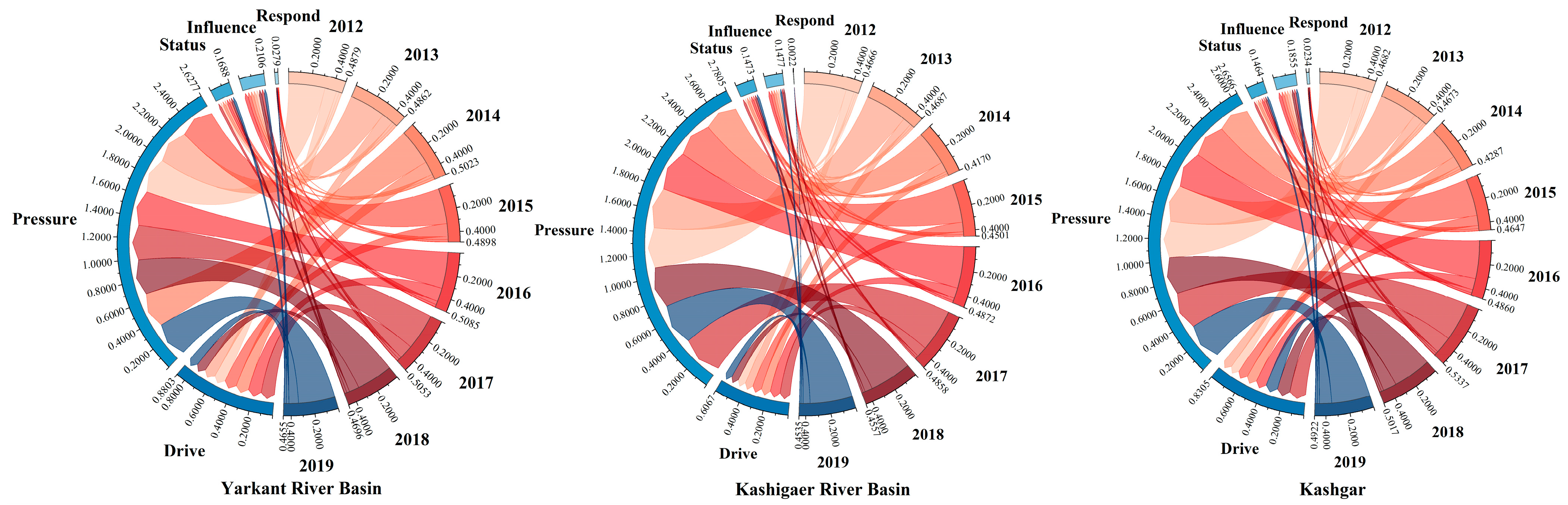Figure 6, the results of the Yarkant River Basin and the Kashigaer River Basin are similar in the DPSIR model, with the drive index increasing and then decreasing, resulting in the pressure index decreasing and then increasing due to natural and anthropogenic factors, but persisting. The long-term pressure leads to the deterioration of ecological status beyond its capacity to self-regulate. The change in the status index affects numerous aspects, with a large number of negative impacts leading to a decrease in the influence index. These influences have prompted the implementation of the response measures, yet with inadequate strength and limited effect. A correlation has been observed between drive and response index, characterized by a lagging response in the early stage and a weakening drive index, but an increasing response in the later stage. The drive and the response indexes are correlated, with the response lagging in the early stage and the drive weakening, but the response increasing in the later stage. The DPSIR model in the Kashgar Prefecture also showed that after the drive leads to a change in the pressure and thus in the ecological state, the decrease in state exacerbated the negative influences, and the response strength urgently needed to be strengthened. Therefore, the factors of the DPSIR model are intertwined to affect the ecology and development of the watershed.