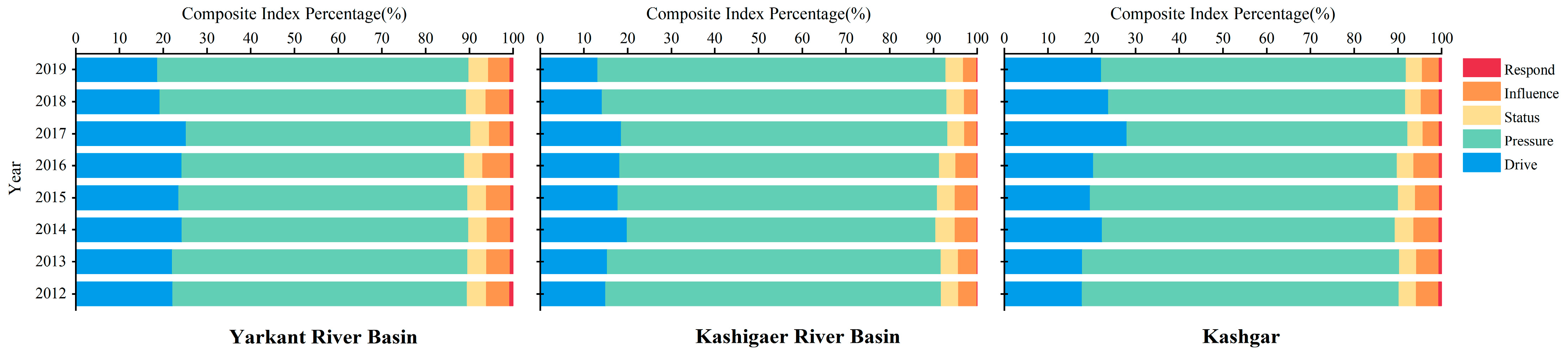 The spatio-temporal evolution of the Kashgar Prefecture’s DPSIR model exhibits common characteristics of high pressure and low response. Differences between the two river basins and the Kashgar Prefecture lie only in the sources of drive and the magnitude of pressure fluctuations. Although the drive index slowed in the later period, long-term dual pressures from human activities and nature have exceeded the ecosystem’s self-regulation capacity. The persistently low response index reflects the limited effectiveness of existing governance measures, which have become a key factor in the increased vulnerability of the local water ecosystem and a constraint on improving basin resilience.