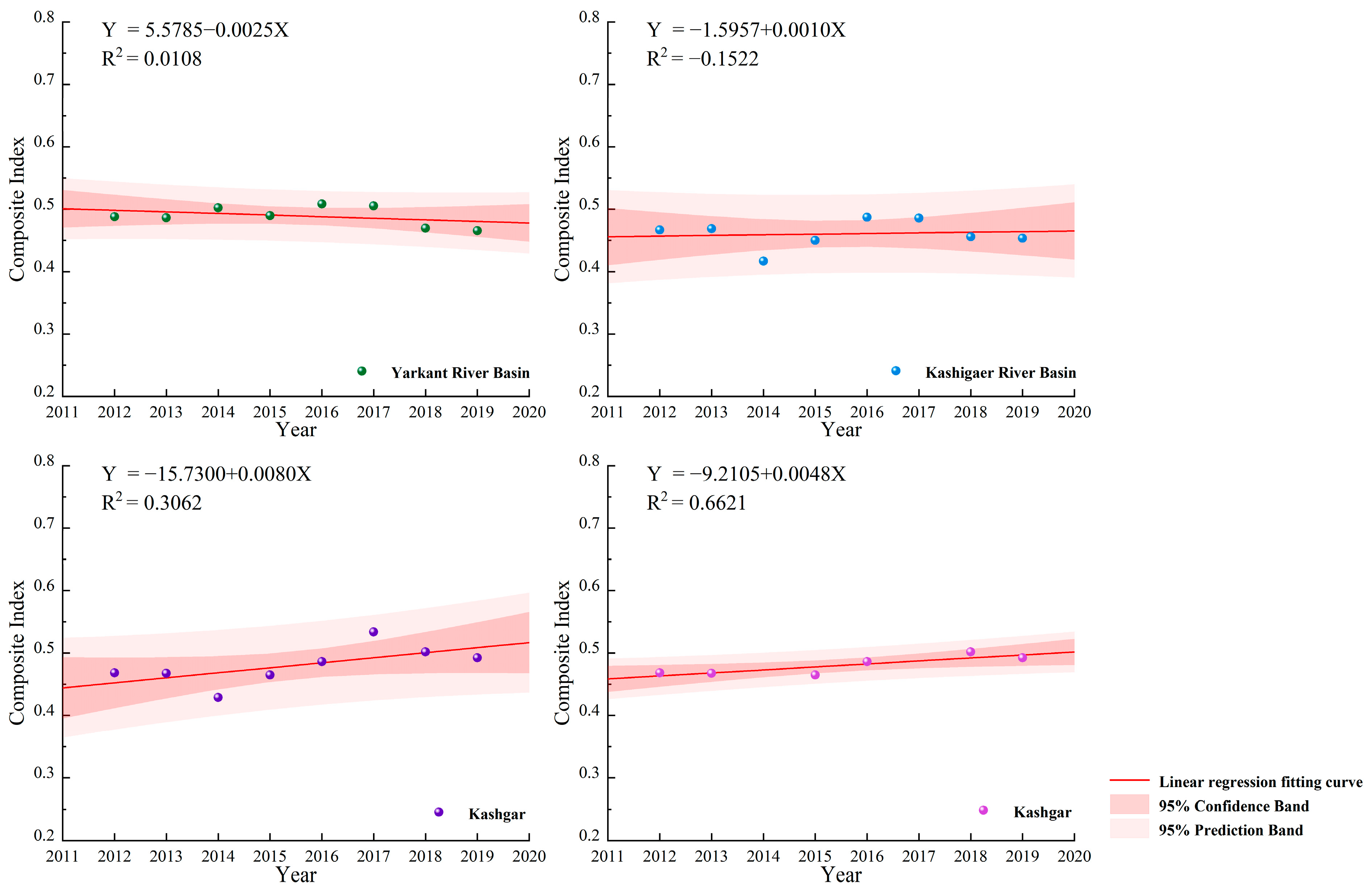 Figure 9, the regression prediction of water ecological security in the Yarkant River Basin, Kashigaer River Basin and Kashgar Prefecture indicates that changes in the Yarkant River Basin are influenced by the interaction of multiple factors in 2011–2019, with a weak decreasing trend of the composite index and a low model fit The Kashigaer River Basin shows a slight increase in the composite index in 2011–2019, but the model fit is also low. The Kashgar Prefecture shows a slow increasing trend in the composite index from 2011–2019. In 2014 and 2017, the index fluctuated abnormally due to the influence of industrial restructuring and extreme climate factors. Following deletion and optimization, the degree of fit was greatly improved, indicating that the model has a better degree of fit, better reflecting the trend of the composite index of water ecological securityin the Kashgar Prefecture. It shows an upward trend, yet the rate of increase has decelerated, suggesting that the water ecological security situation of the Kashgar Prefecture has improved, though at a gradual pace. This further indicates that, although the water ecological security situation in Kashgar Prefecture has improved, the process is slow and may remain in a fair state in the next few years, potentially being affected more.