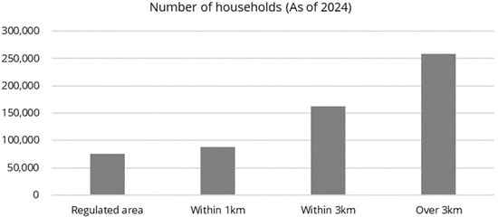 However, as seen in the transaction volumes and Table 1, the number of transaction cases in areas beyond 3 km is disproportionately high. Furthermore, as shown in Figure 4, the number of households as of 2024 varies by up to 3.4 times across different sections. Such disparities in sample size and residential density, illustrated in Figure 4, require cautious interpretation when evaluating average values across these distance-based segments.