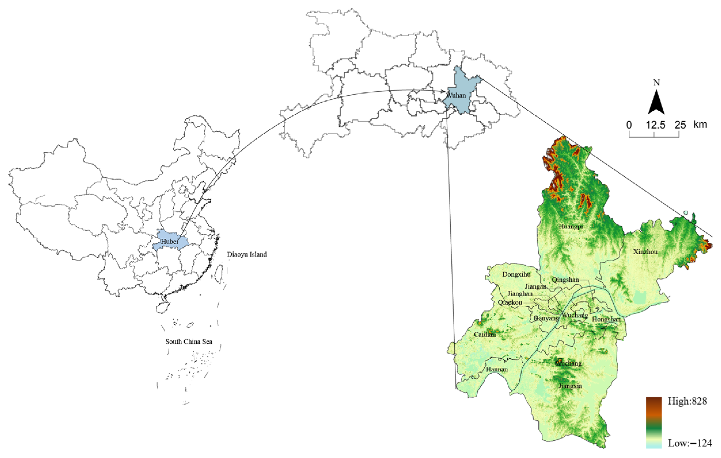 Figure 1. Geographical Location of Wuhan. The inset maps locate Wuhan within Hubei Province and China. The background raster in the Wuhan panel shows DEM-based elevation (m) to provide topographic context for the municipality (higher values indicate higher terrain). Administrative district boundaries are overlaid for reference; the north arrow and scale bar are shown.