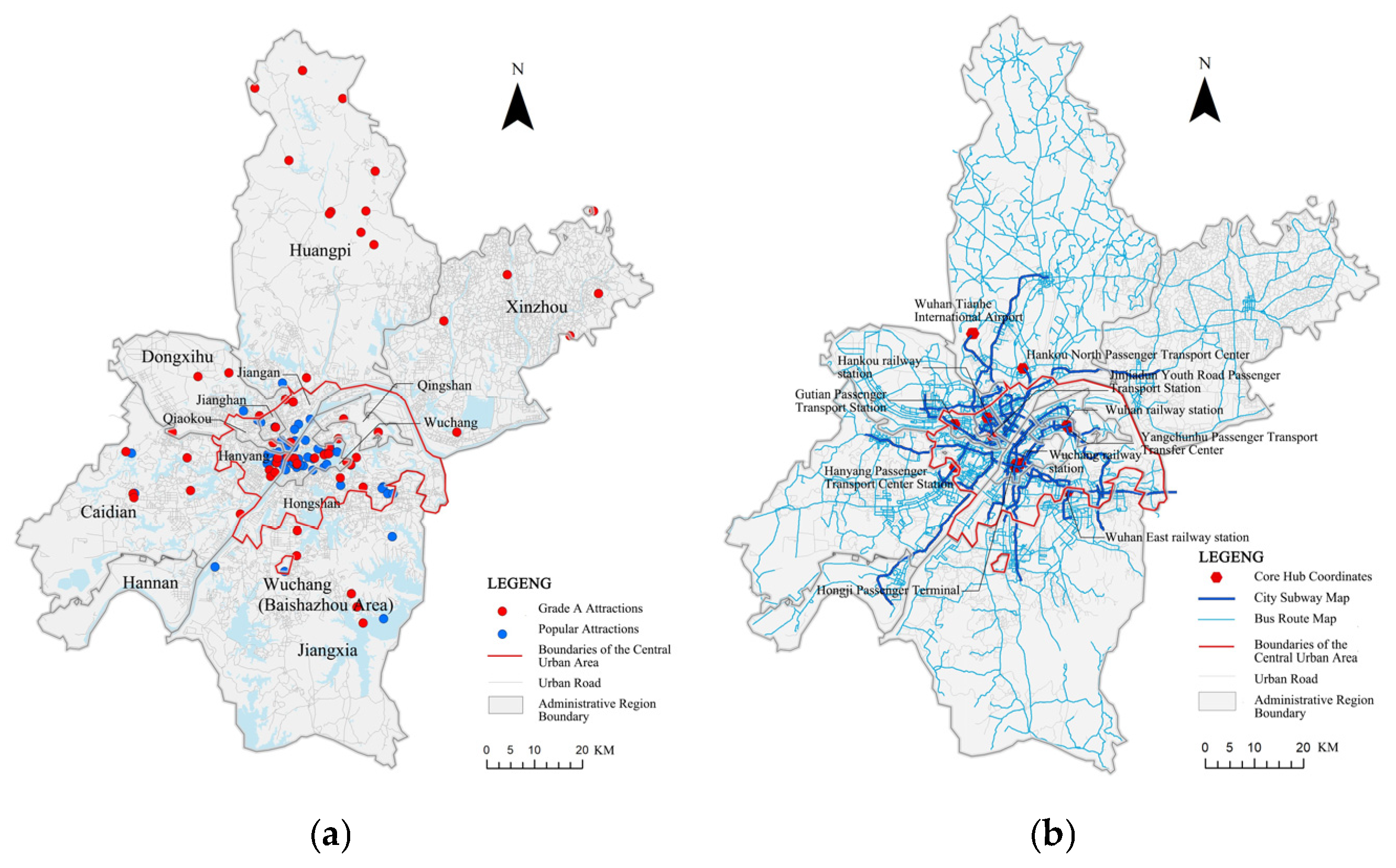Figure 2. Urban context of attractions and public transport in Wuhan. (a) Administrative divisions and the spatial distribution of attractions included in this study. Red points indicate A-rated attractions, and blue points indicate popular, unrated attractions. The red outline denotes the central urban area boundary; grey lines represent the main urban road network; administrative boundaries are shown for reference. (b) Public transport network layers and major inter-city gateways are used as origin hubs in the OD travel-time analysis. The city subway network and bus route network are overlaid (see legend), and red symbols mark core transport hubs (e.g., railway stations, airports, and passenger transport centers). The red outline denotes the central urban area boundary; grey lines represent urban roads; administrative boundaries are shown for reference. North arrow and scale bar are provided.
