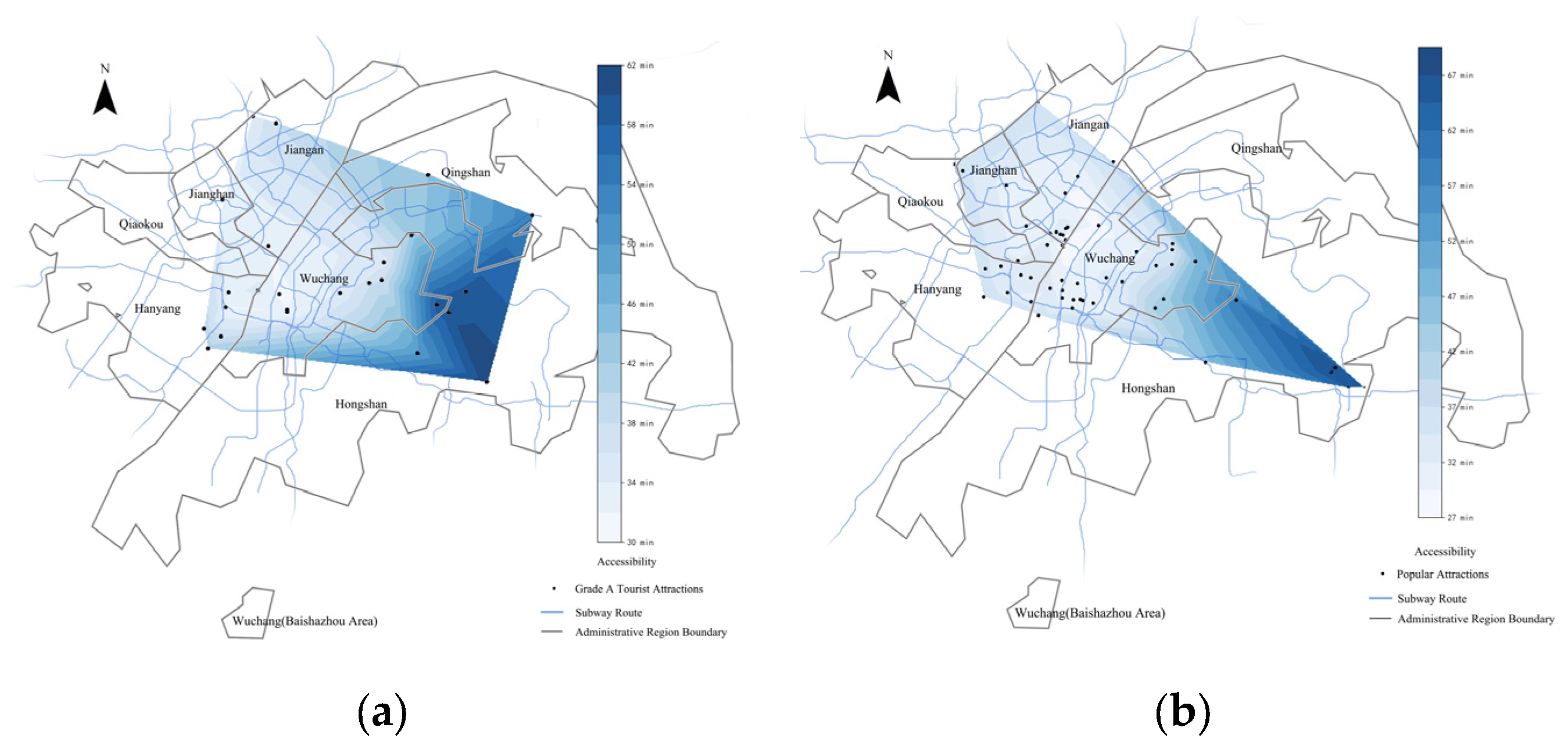 40. Zhang, Q.; Xie, S.; Wang, X.; Jiang, L.; Gu, H.; Liu, D. Tourism attraction accessibility evaluation based on spatial syntax: A case study of Wuhan. Econ. Geogr. 2015, 35, 200–208. [Google Scholar]