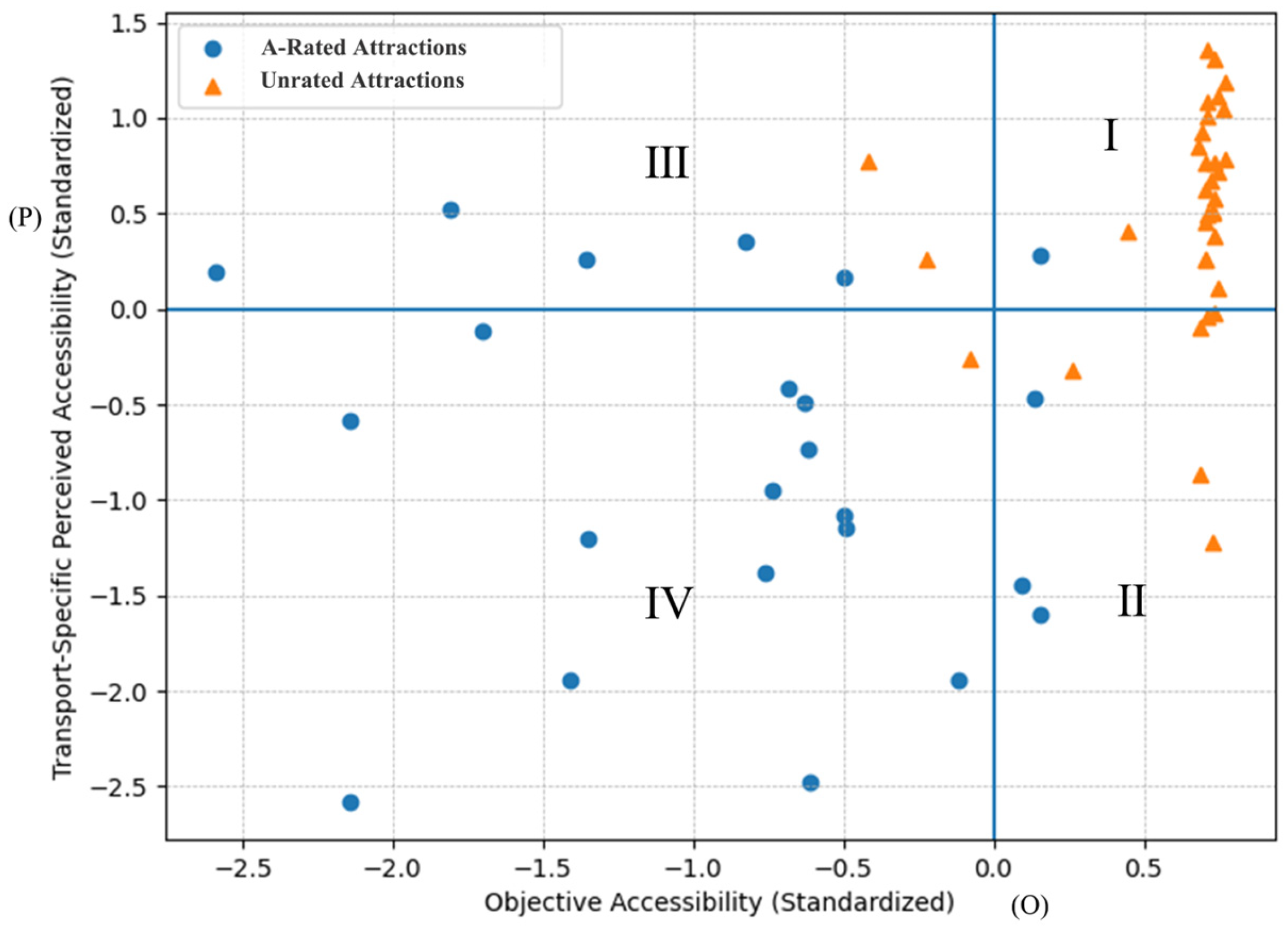 Both objective and transport-specific perceived accessibility indicators were standardized using Z-scores. The mean value (0 after standardization) was used as the threshold to divide attractions into high and low groups along each dimension.