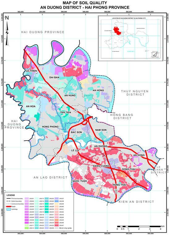 The development of a land quality map comprising 47 land mapping units (LMUs), which integrates comprehensive information on soil characteristics and properties and provides a scientific basis for decision-making related to land use and land management in An Duong District. Accordingly, land units with favorable soil quality, sufficient spatial extent, and suitable characteristics for the cultivation of key crops can be prioritized and conserved as high-quality agricultural production zones. These zones can be integrated with ecotourism and community-based tourism activities. At the same time, such areas contribute to the formation of green buffer zones and ecological spaces, helping to mitigate negative environmental impacts associated with industrialization and urbanization in the district.