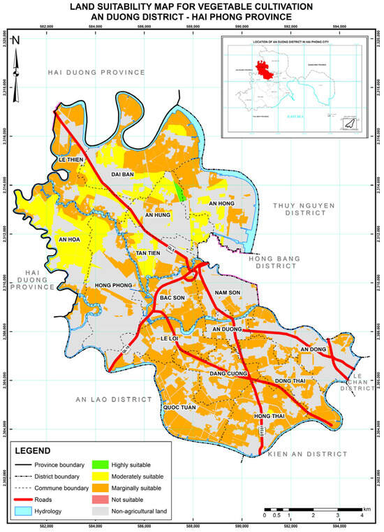 In the context of rapid industrialization and urbanization, which has led to a continuous reduction in agricultural land area, the efficient utilization of the remaining agricultural land is of critical importance to the socio-economic development of An Duong District, especially with regard to food security. Using GIS-based techniques, this study assessed land suitability for six major crop types in the district. Among these, three crops were selected as the key crops for agricultural development toward 2030: rice (to ensure stable food supply), vegetables, and flowers (as major commodities supplying both domestic and international markets).
