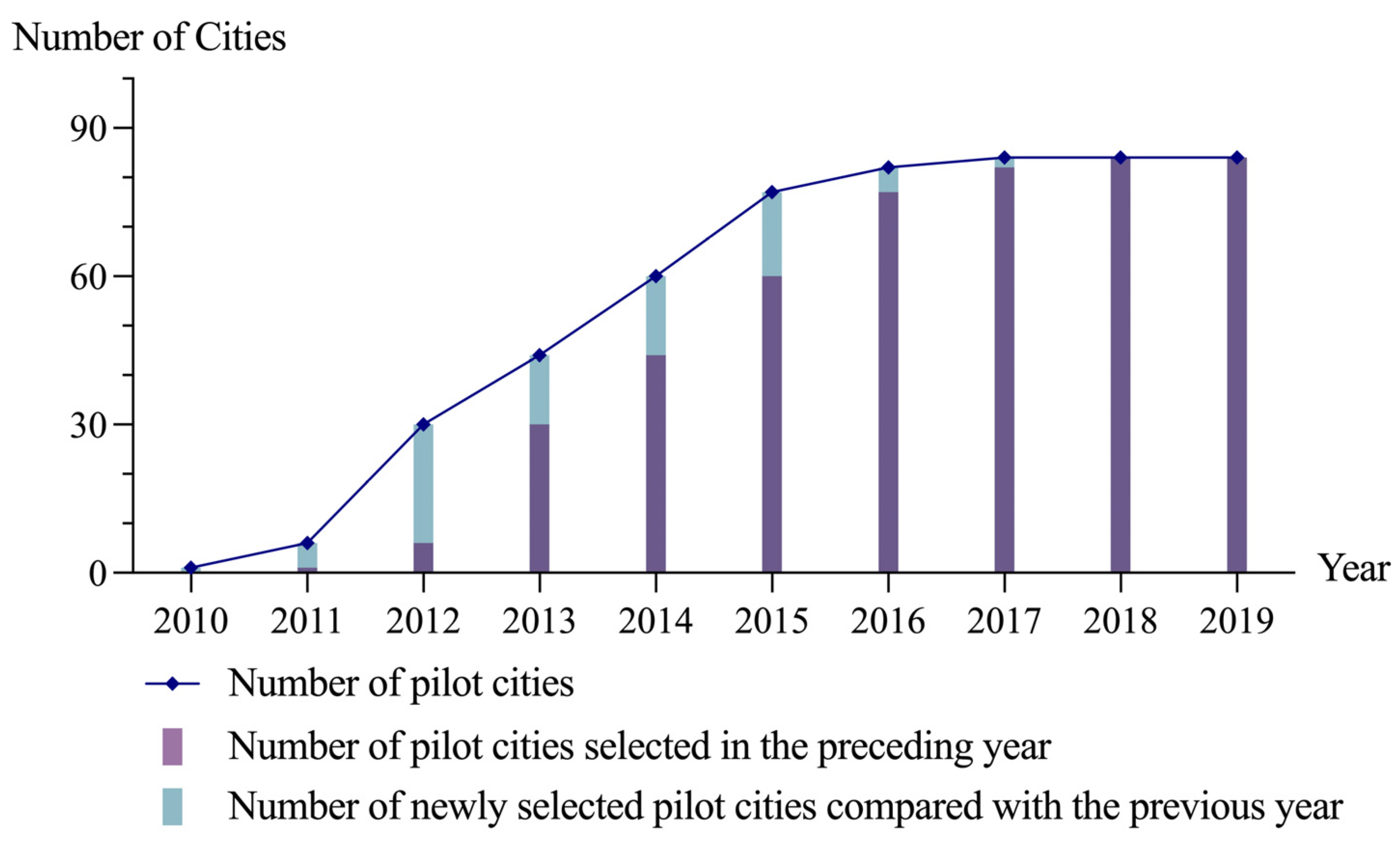 Figure 2, this study selects 2010 as the starting year for policy evaluation, as it marks the launch of the first batch of low-carbon city pilots initiated by the NDRC. This policy integrated multiple environmental regulatory tools and adopted a pilot governance model, signifying a major milestone in China’s comprehensive environmental regulation efforts with far-reaching implications. Additionally, the choice of 2010 precedes the incorporation of ecological civilization construction into the national “Five-Sphere Integrated Plan” during the 18th National Congress of the Communist Party of China in 2012. This enables a more comprehensive understanding of the evolution of China’s ecological civilization construction from a temporal perspective, capturing the trajectory of policy development over time. The number of pilot cities has exhibited a steadily increasing trend since 2010. The year 2012 saw the largest increase, with 24 new cities selected. In the same year, the 18th National Congress of the Communist Party of China established ecological civilization construction as a fundamental national policy and incorporated it into the “Five-Sphere Integrated Plan.” This development led to the launch and comprehensive rollout of numerous related policies and pilot projects. Between 2011 and 2015, the number of pilot cities continued to grow steadily, in alignment with the implementation of the 13th Five-Year Plan, reflecting the gradual expansion of policy implementation and regional coverage. The promulgation of the Plan provided the institutional framework—commonly referred to as the ‘four beams and eight pillars’—thereby marking ecological civilization construction’s transition into a new stage of institutionalization. Following this, the 2016 issuance of the