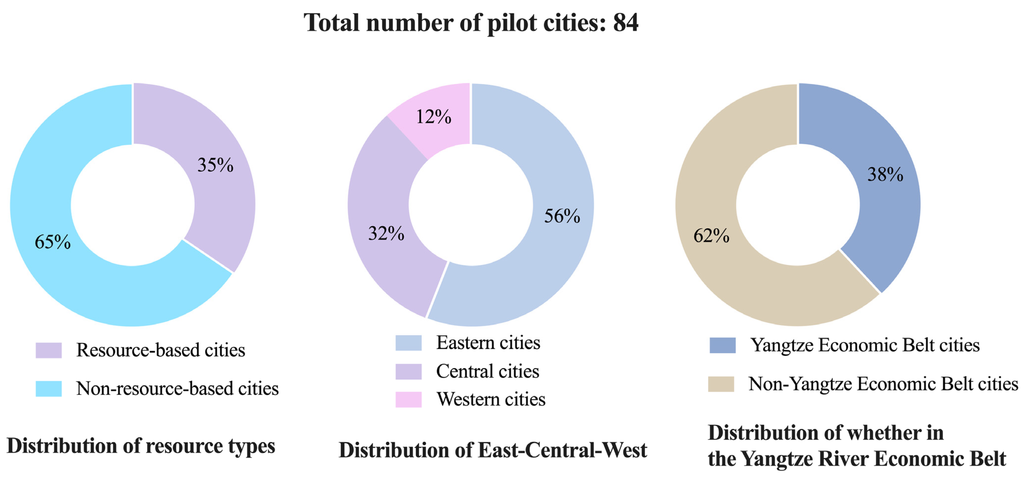 Beyond the temporal dimension, this study also examines the spatial characteristics of pilot cities, including their resource endowments, regional distribution across eastern, central, and western China, and the distinction between the Yangtze River Economic Belt and non-Yangtze River areas. This spatial distribution corresponds closely with national policy orientations and provides complementary validation of the selection framework. These spatial patterns offer further support for the heterogeneity analysis, as illustrated in