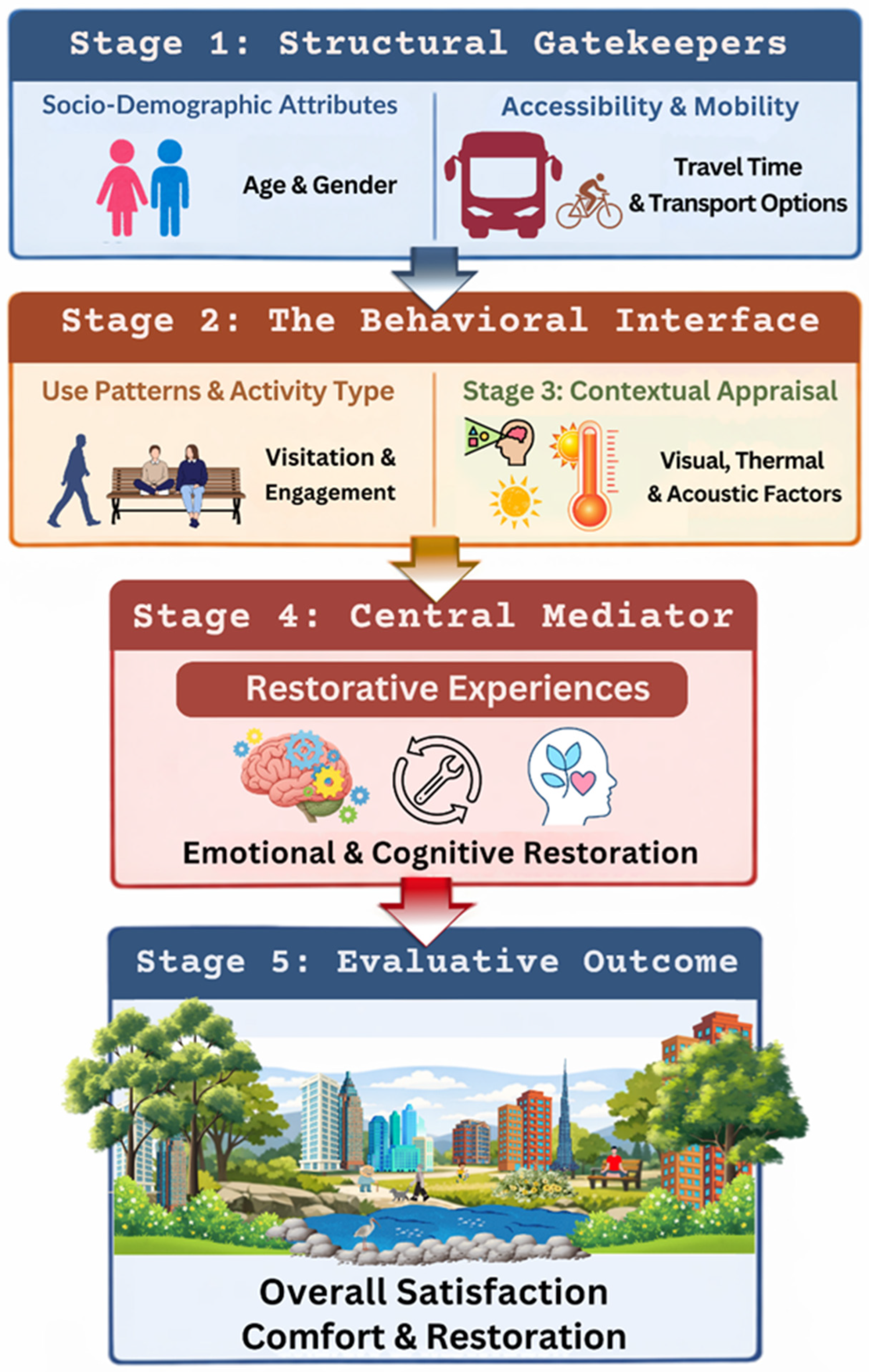 58]. However, population-level confirmation would require representative sampling. Beyond contributing to the established evidence base, this study advances the literature by foregrounding the embodied dimensions of restoration and providing rare exploratory evidence from a high-density Global South megacity. In this sample, post-visit relaxation and activity type emerged as stronger satisfaction factors than visual preference or green cover, suggesting that somatic relief may outweigh cognitive restoration in stress-intensive environments, though this warrants testing in larger representative samples [