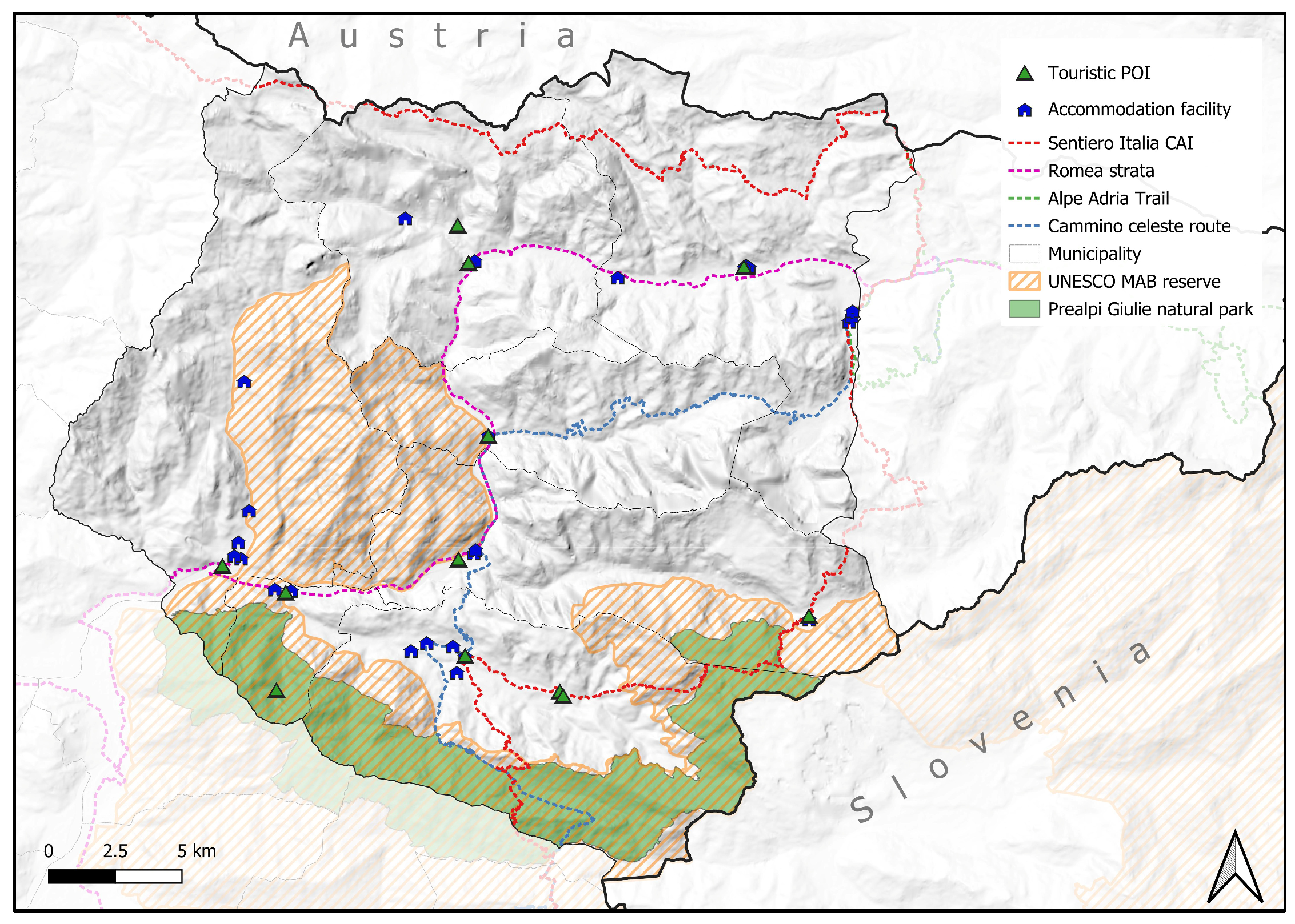 Figure 2 delineates the administrative boundaries of the seven municipalities and illustrates the principal hiking routes crossing the valleys—such as the Romea Strata, Sentiero Italia CAI, Alpe Adria Trail, and Cammino Celeste—together with the spatial distribution of accommodation facilities and major tourist points of interest (POIs). The figure also highlights the main protected areas, including the Julian Prealps Natural Park and the UNESCO Man and the Biosphere (MAB) Julian Alps Biosphere Reserve (established in June 2019, the Biosphere Reserve extends across eleven municipalities). Overall, the presence of these protected areas across multiple jurisdictions underscores the strong interconnections between administrative boundaries and natural heritage.