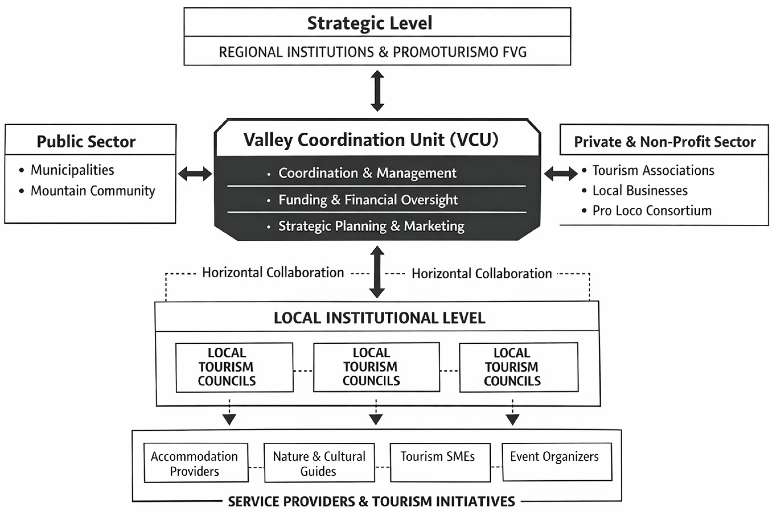 This study addresses this gap by analyzing the territorial governance system of the Val Canale and Canal del Ferro valleys in Northeast Italy and by co-designing a stakeholder-based Organizational Model (OM) for sustainable tourism development. The research is grounded in the premise that strengthening inter-municipal coordination and formalizing stakeholder networks are essential for transforming dispersed initiatives into coherent territorial strategies. The proposed OM constitutes a multi-level governance framework aimed at institutionalizing collaborative mechanisms and enhancing alignment between local and regional actors.