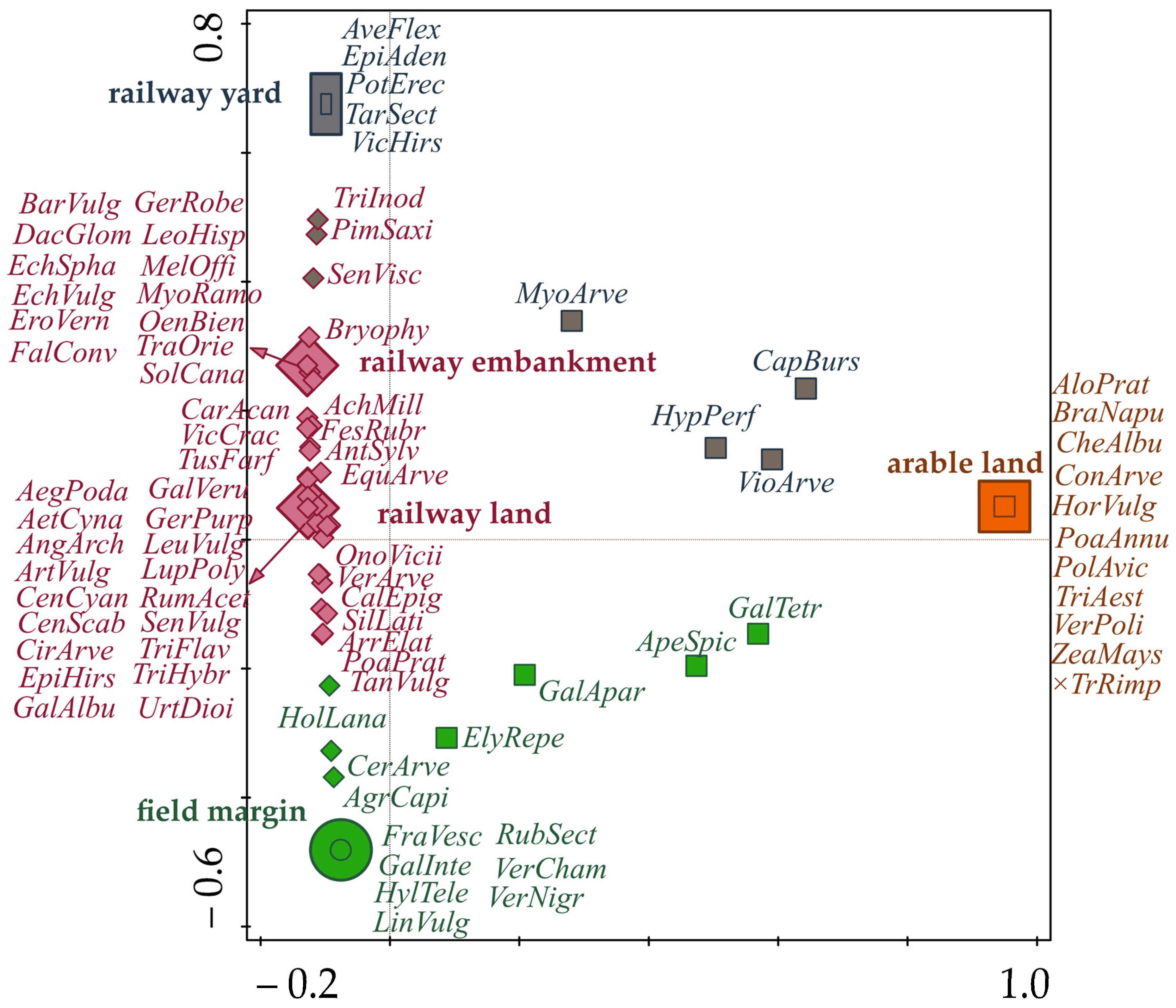 | Railway embankment, railway land | Aegopodium podagraria (AegPoda), Aethusa cynapium (AetCyna), Achillea millefolium (AchMill), Angelica archangelica (AngArch), Anthriscus sylvestris (AntSylv), Arrhenatherum elatius (ArrElat), Artemisia vulgaris (ArtVulg), Barbarea vulgaris (BarVulg), Bryophyta (Bryophy), Calamagrostis epigejos (CalEpig), Carduus acanthoides (CarAcan), Centaurea cyanus (CenCyan), Centaurea scabiosa (CenScab), Cirsium arvense (CirArve), Dactylis glomerata (DacGlom), Echinops sphaerocephalus (EchSpha), Echium vulgare (EchVulg), Epilobium hirsutum (EpiHirs), Equisetum arvense (EquArve), Erophila verna (EroVern), Fallopia convolvulus (FalConv), Festuca rubra (FesRubr), Galium album (GalAlbu), Galium verum (GalVeru), Geranium purpureum (GerPurp), Geranium robertianum (GerRobe), Leontodon hispidus (LeoHisp), Leucanthemum vulgare (LeuVulg), Lupinus polyphyllus (LupPoly), Melilotus officinalis (MelOffi), Myosotis ramosissima (MyoRamo), Oenothera biennis (OenBien), Onobrychis viciifolia (OnoVicii), Poa pratensis (PoaPrat), Rumex acetosa (RumAcet), Senecio vulgaris (SenVulg), Silene latifolia (SilLati), Solidago canadensis (SolCana), Tanacetum vulgare (TanVulg), Tragopogon orientalis (TraOrie), Trifolium hybridum (TriHybr), Trisetum flavescens (TriFlav), Tussilago farfara (TusFarf), Urtica dioica (UrtDioi), Veronica arvensis (VerArve), Vicia cracca (VicCrac) |