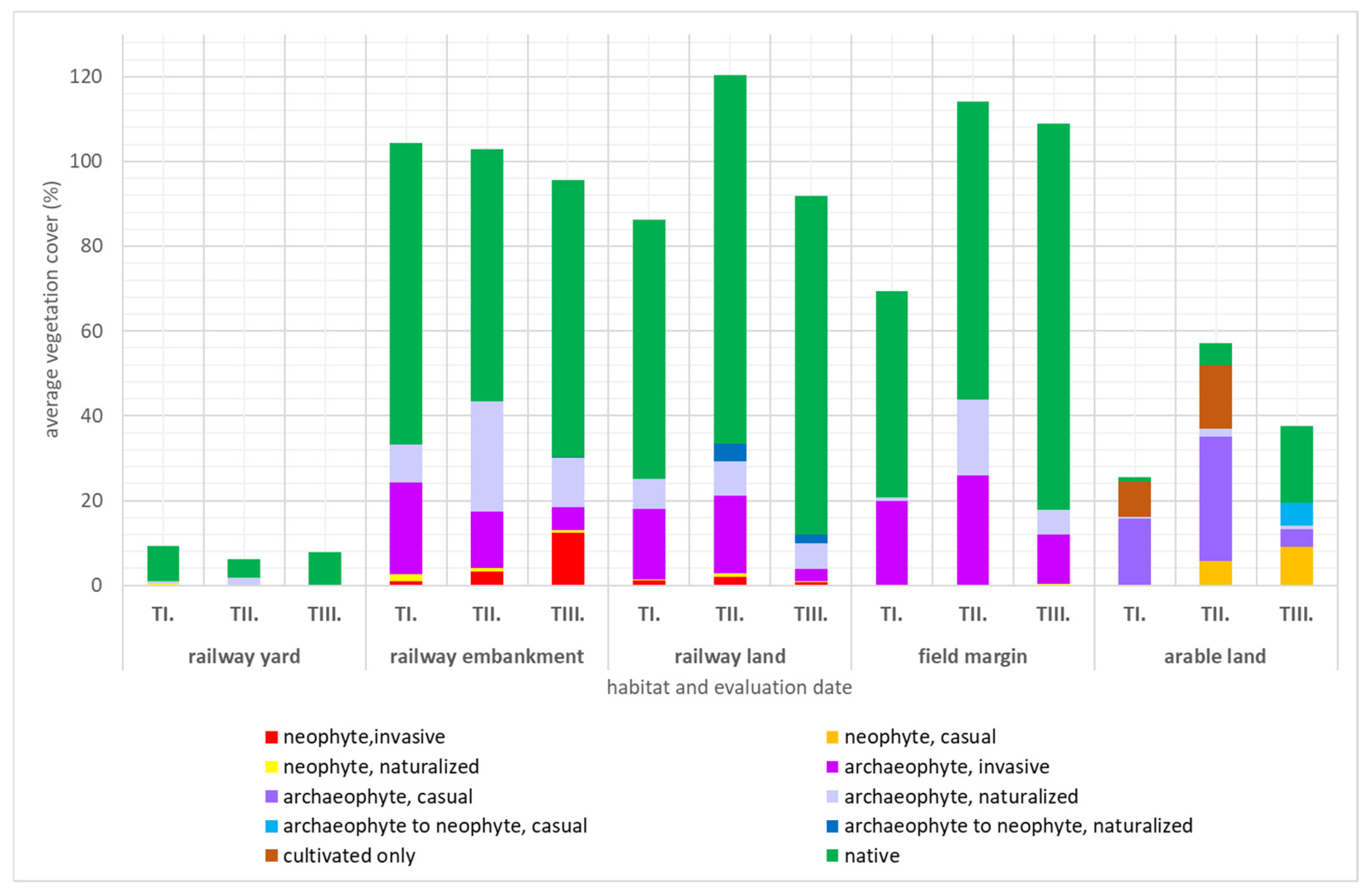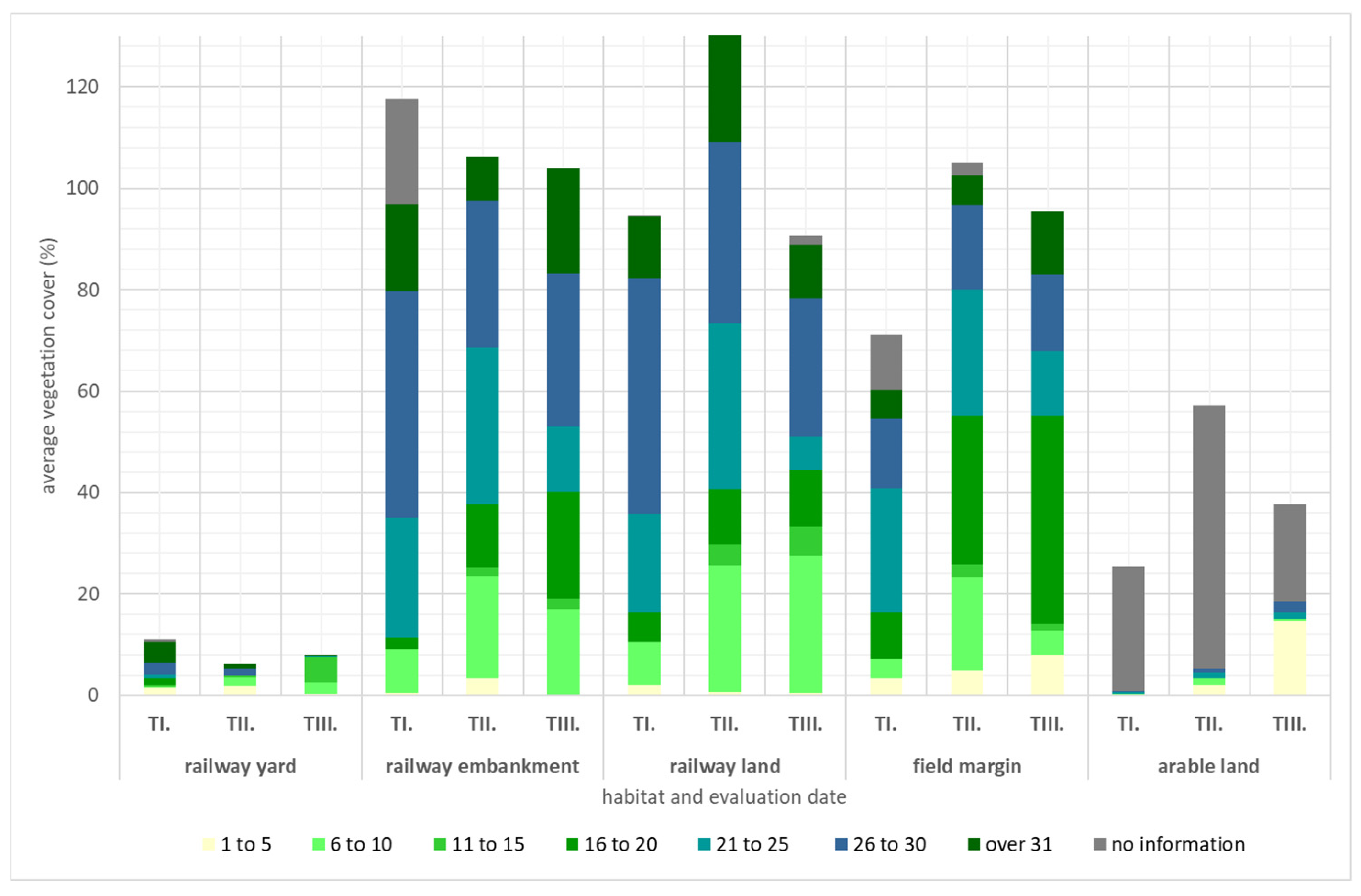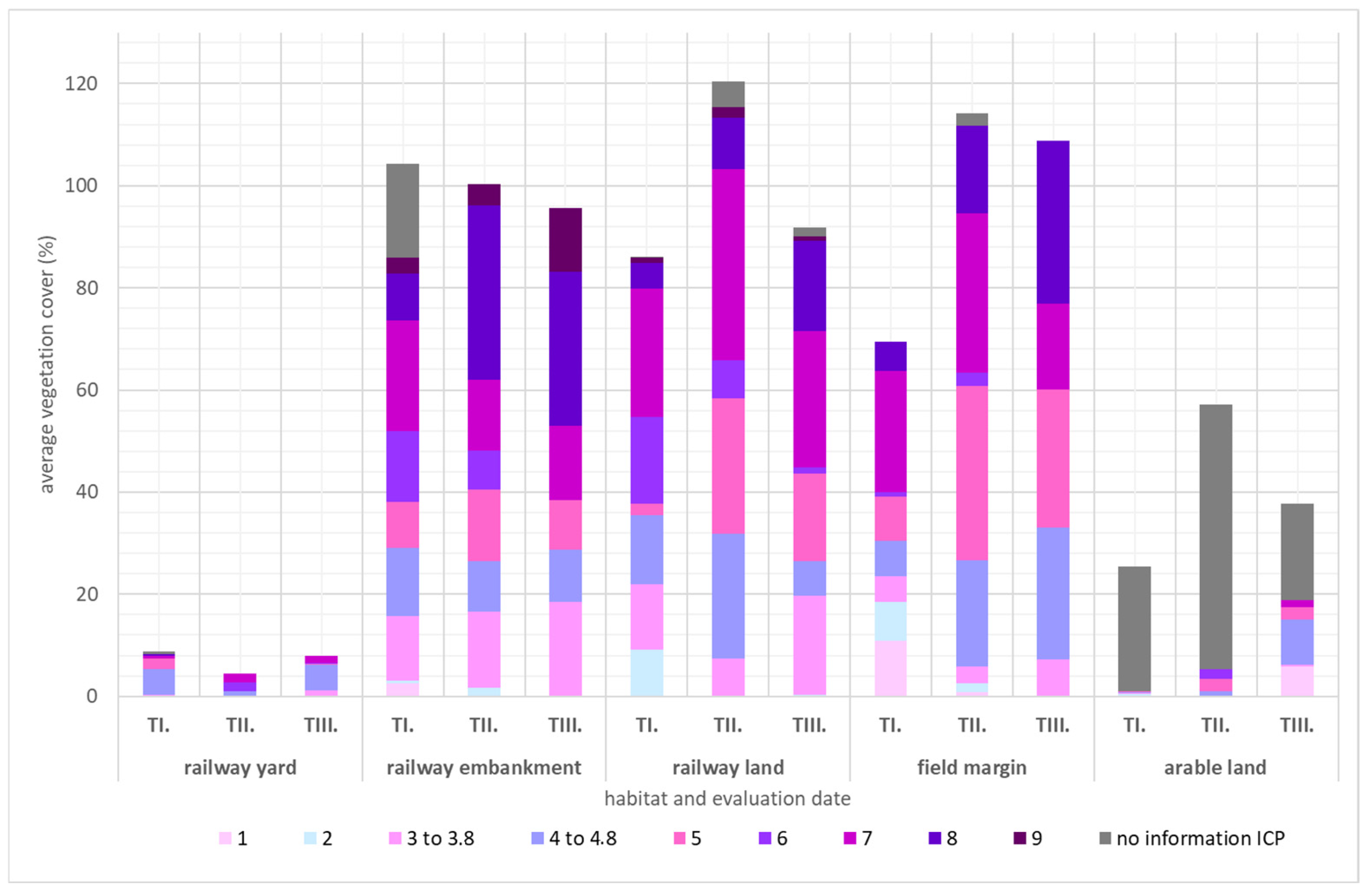 - Vegetation composition and structure differed markedly among habitat types, reflecting variation in substrate properties and disturbance regimes. Species richness was highest in the railway embankment and railway land habitats, which exhibited highly similar species composition, whereas the lowest richness occurred in the railway yard and arable land habitats.