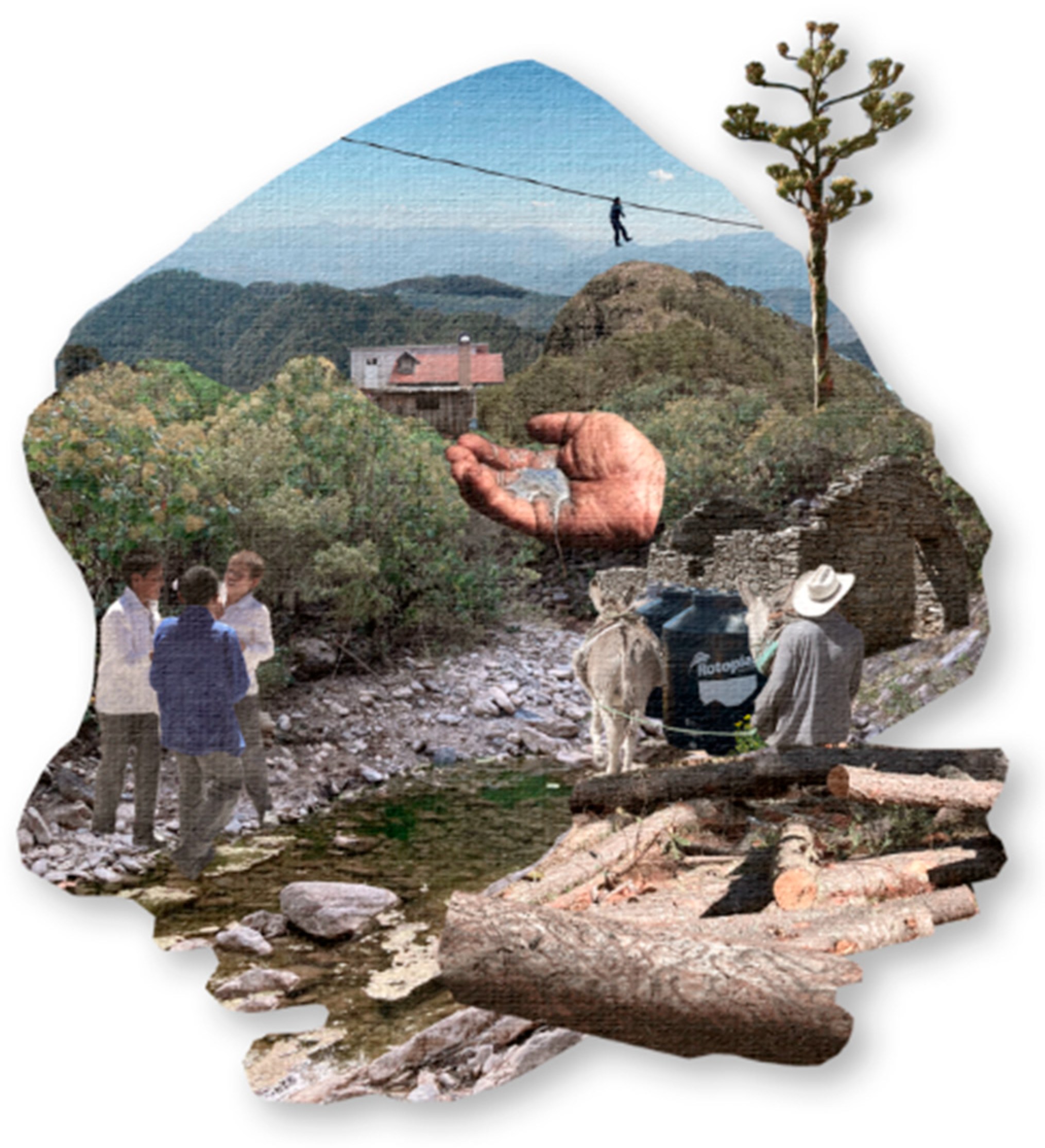 - ‘Living Connections’ (2024) works around public space, proposing an intervention in the ejido house to convert it into a centre for administration, commerce, leisure, play and learning in the community, as well as cleaning the pot through a chinanpas system and reactivating the community house. Finally, a landscaping intervention on the ‘maguey path’ that connects these two points in the community.