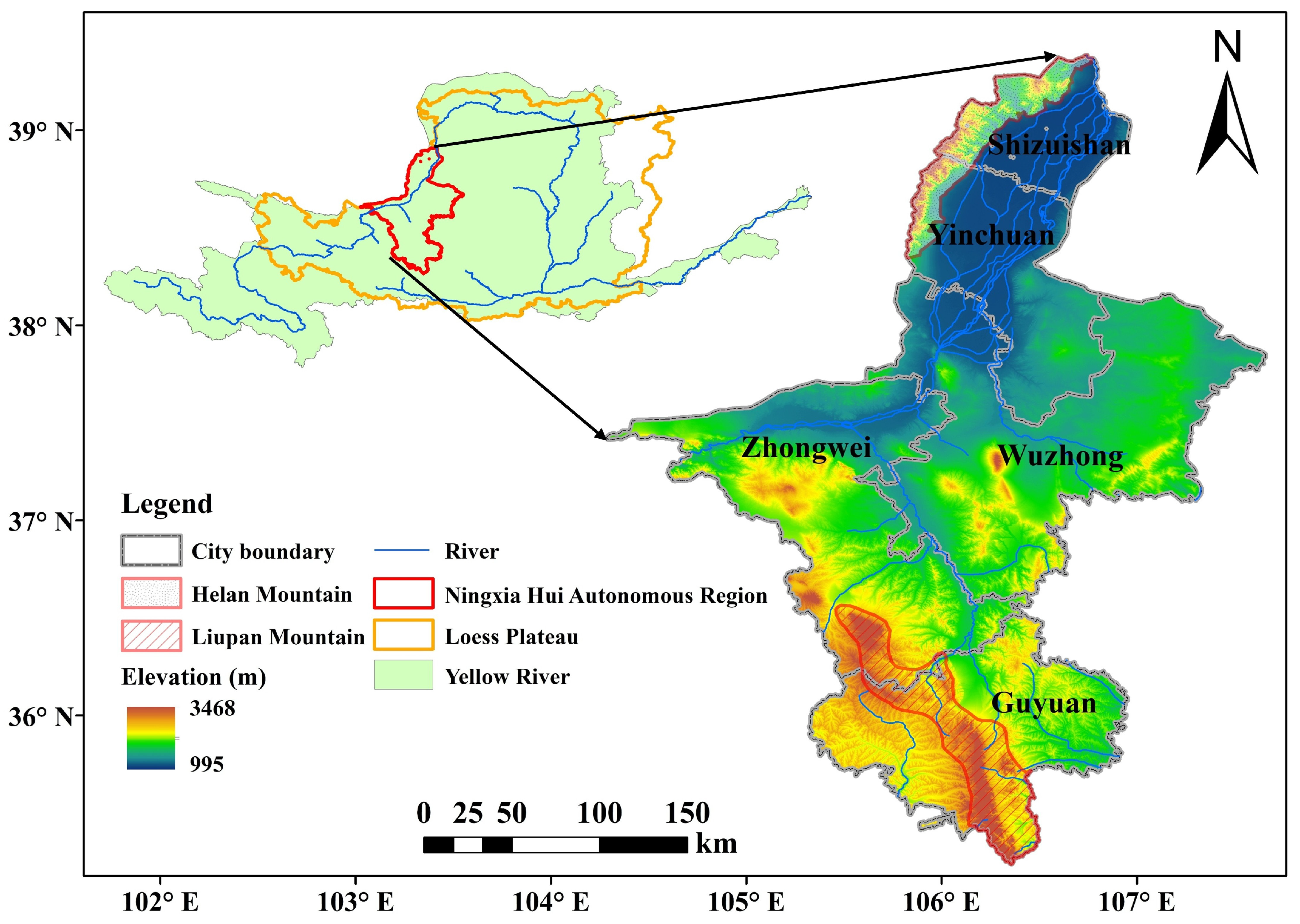 - Shen, W.; Li, Y.; Qin, Y. Research on the Influencing Factors and Multi-Scale Regulatory Pathway of Ecosystem Health: A Case Study in the Middle Reaches of the Yellow River, China. J. Clean. Prod. 2023, 406, 137038. [Google Scholar] [CrossRef]