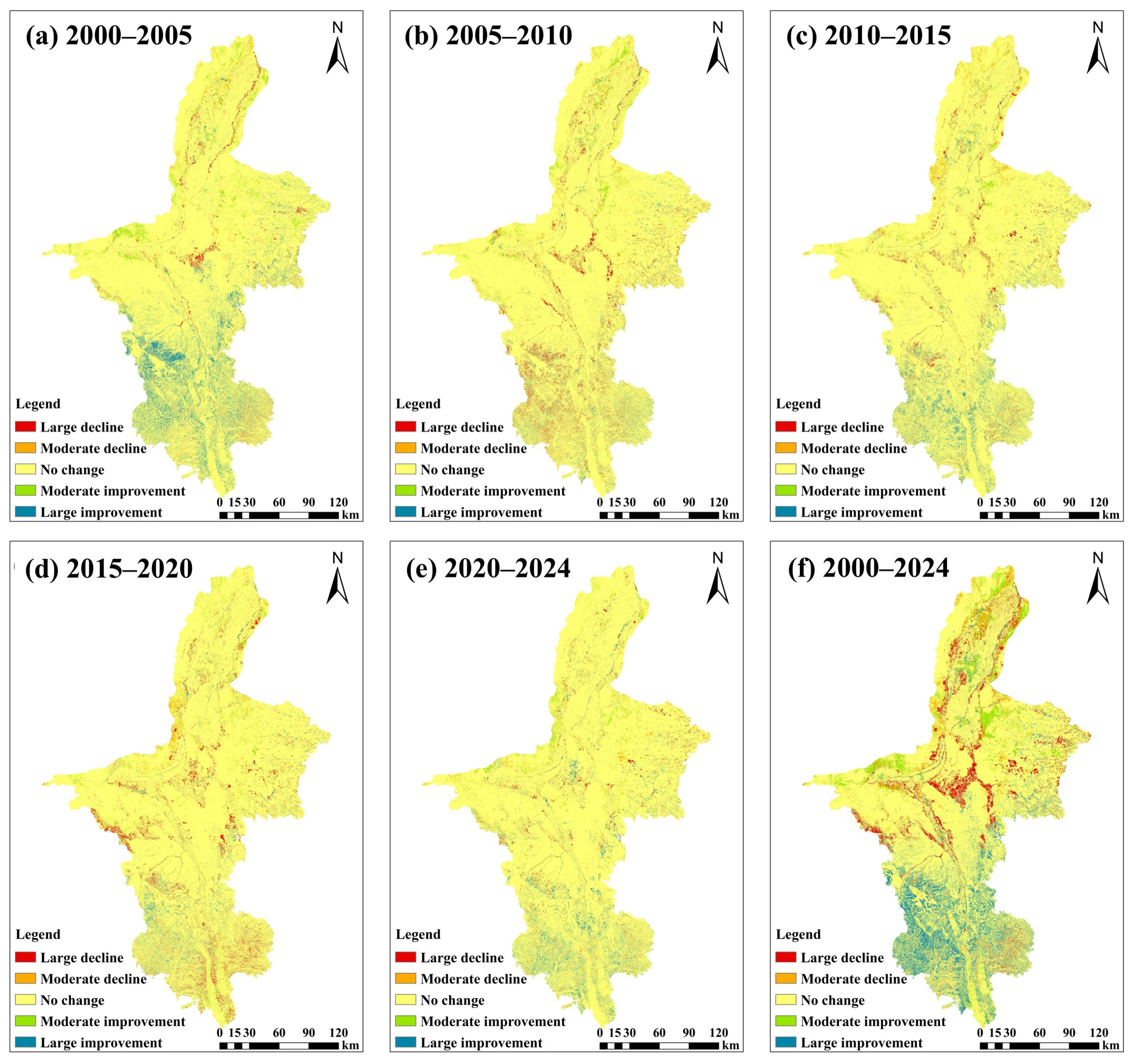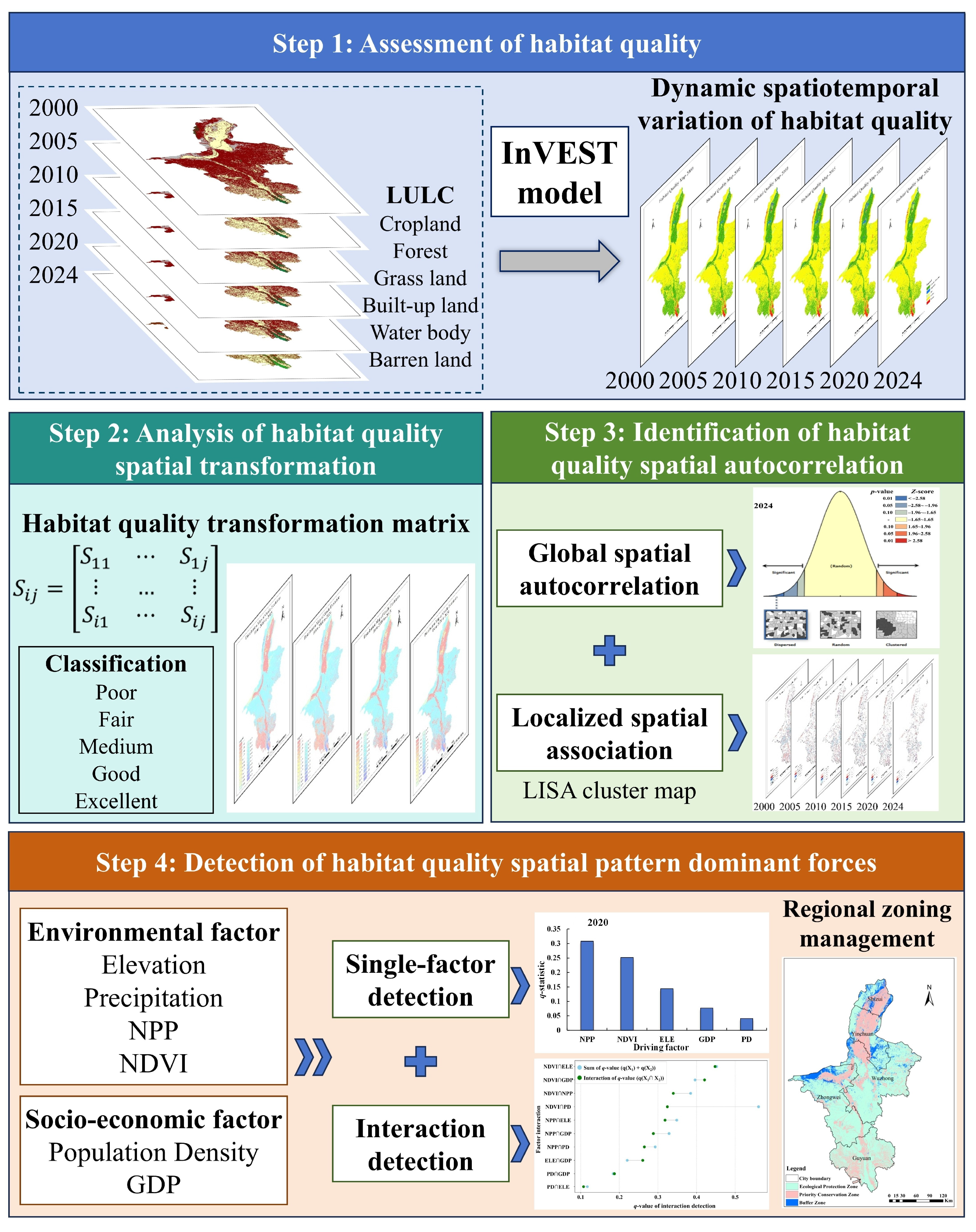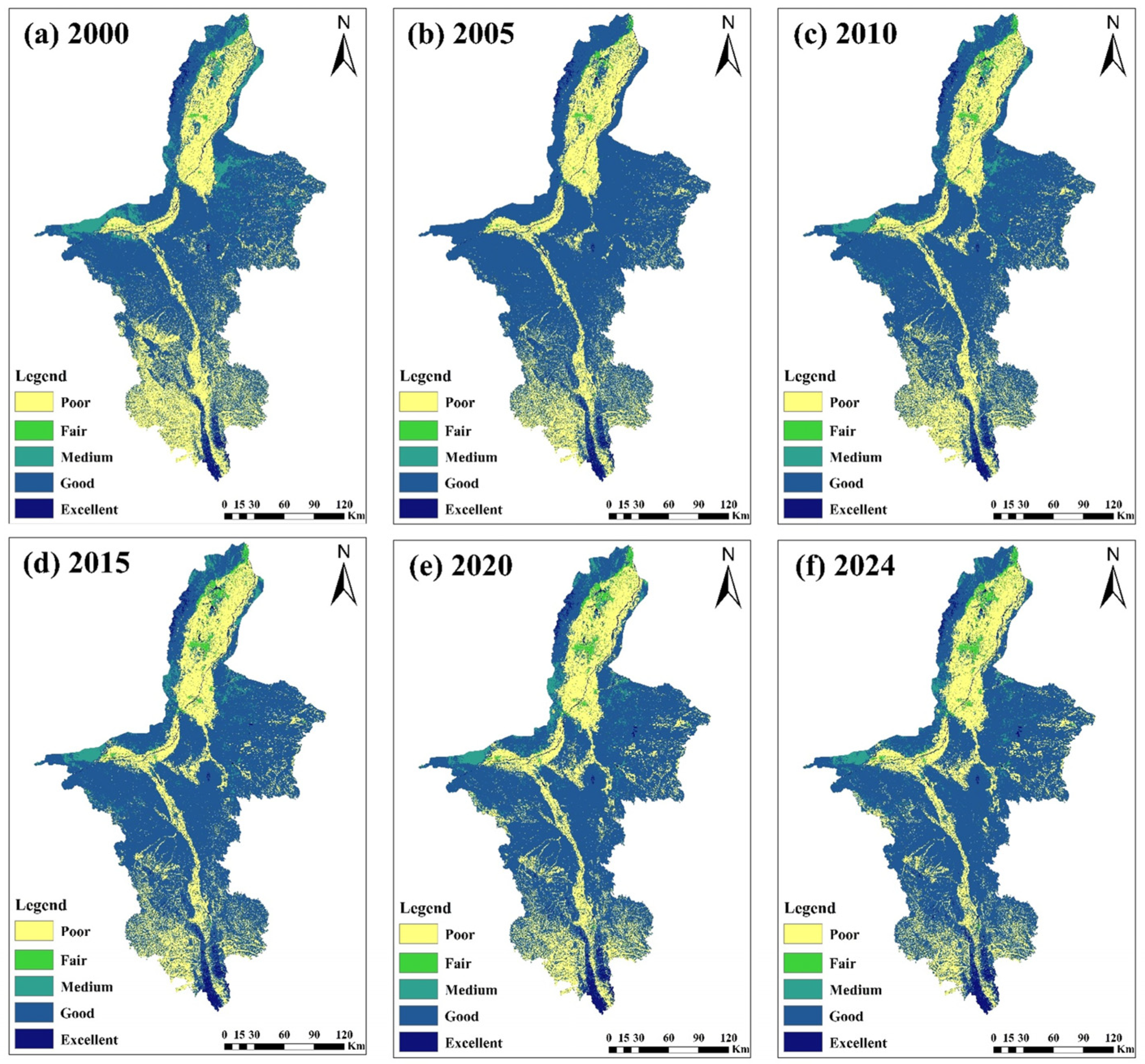 - From 2000 to 2024, the habitat quality of Ningxia is dominated by good habitats. The proportion of poor habitat area increased from 29.26% to 24.63%, with excellent habitats largely recovered and a net positive change of 5.12%.