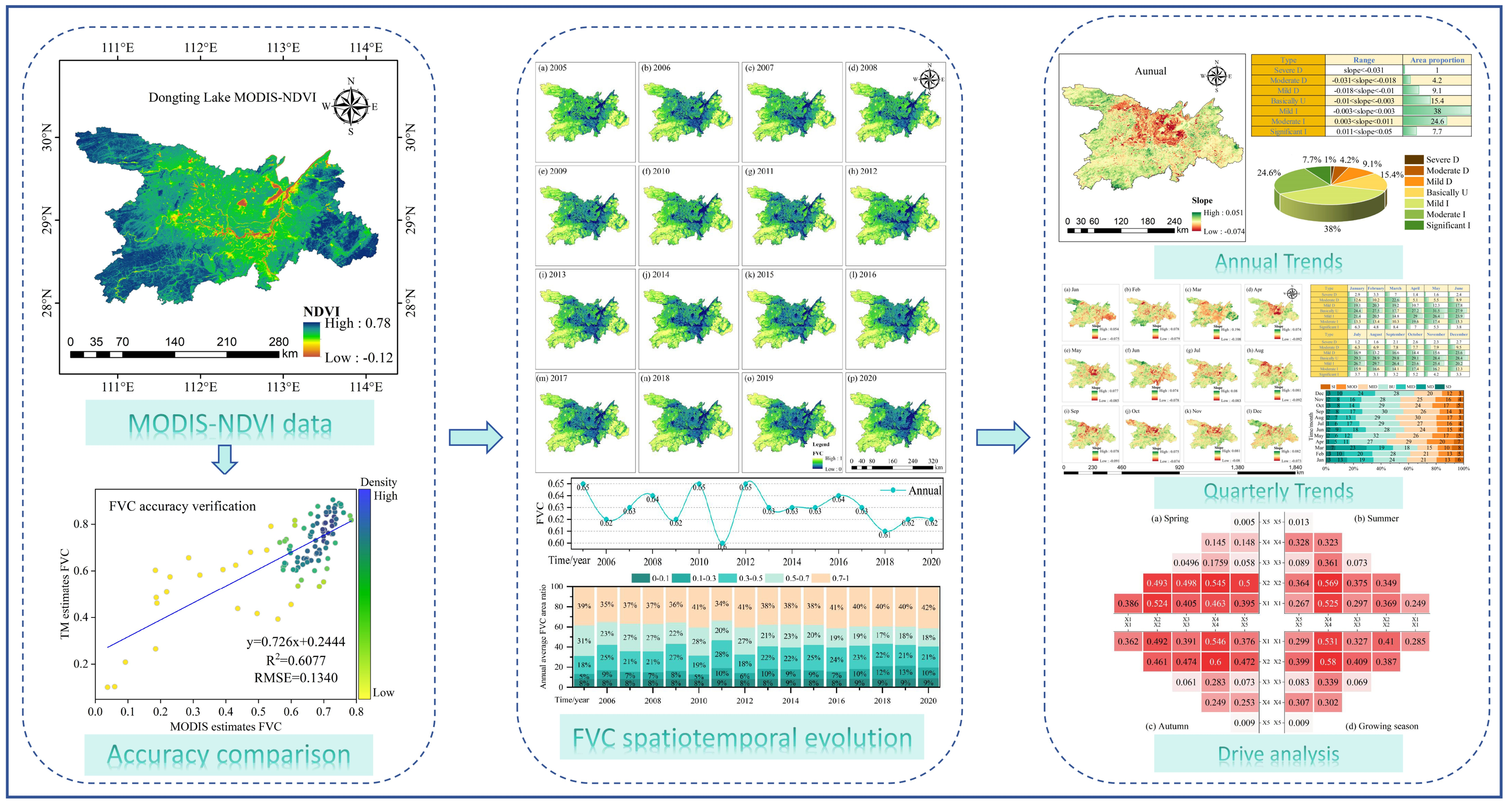 - From 2005 to 2020, the FVC in Dongting Lake showed a significant improvement trend, with 70.3% of the total area seeing an increase. Spring’s overall vegetation FVC improved, while summer, autumn, and the growth season had a relatively large unchanged proportion, indicating that future ecological restoration should focus more on these three seasons. Vegetation FVC degradation was most severe in March and December.