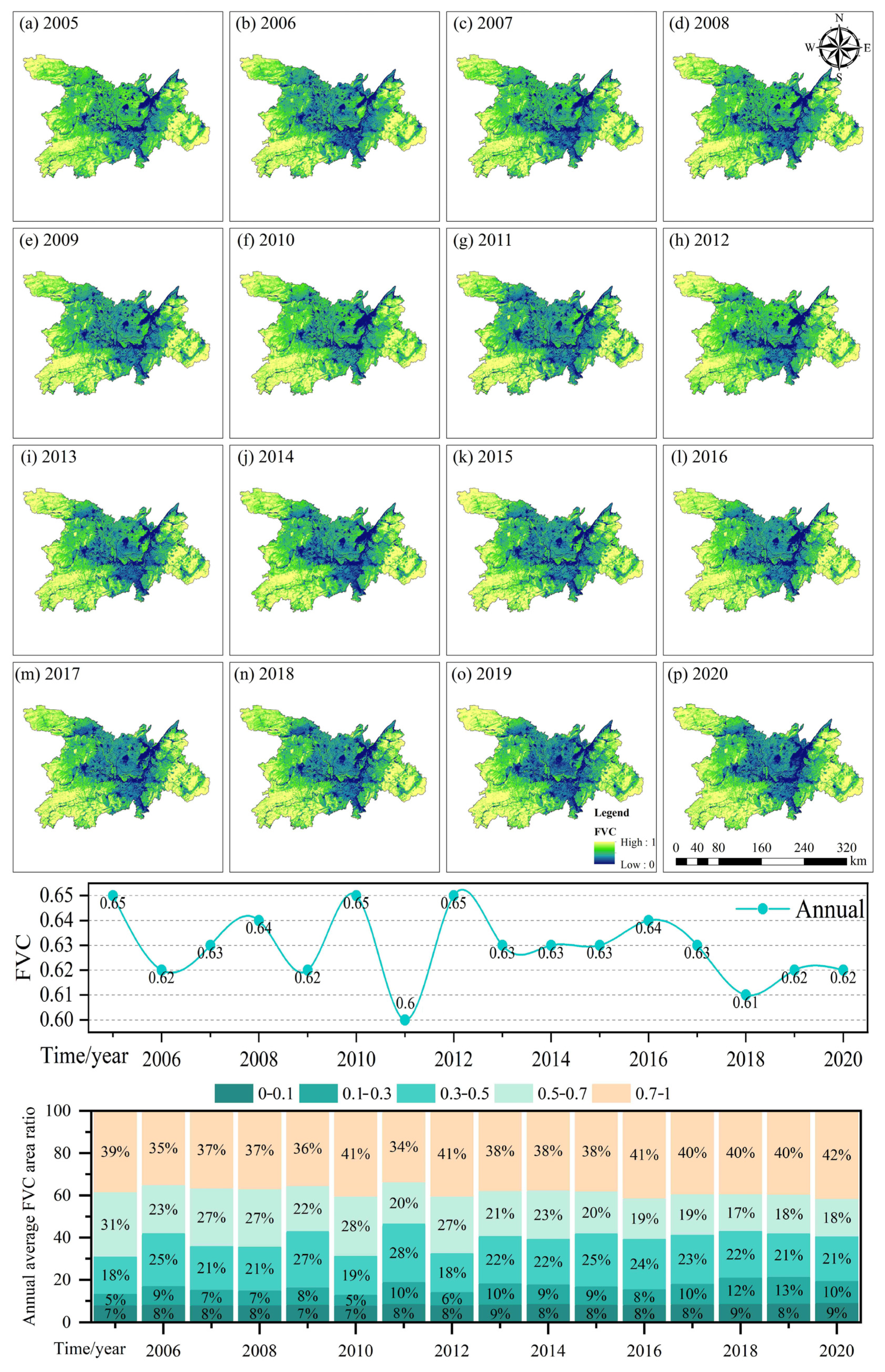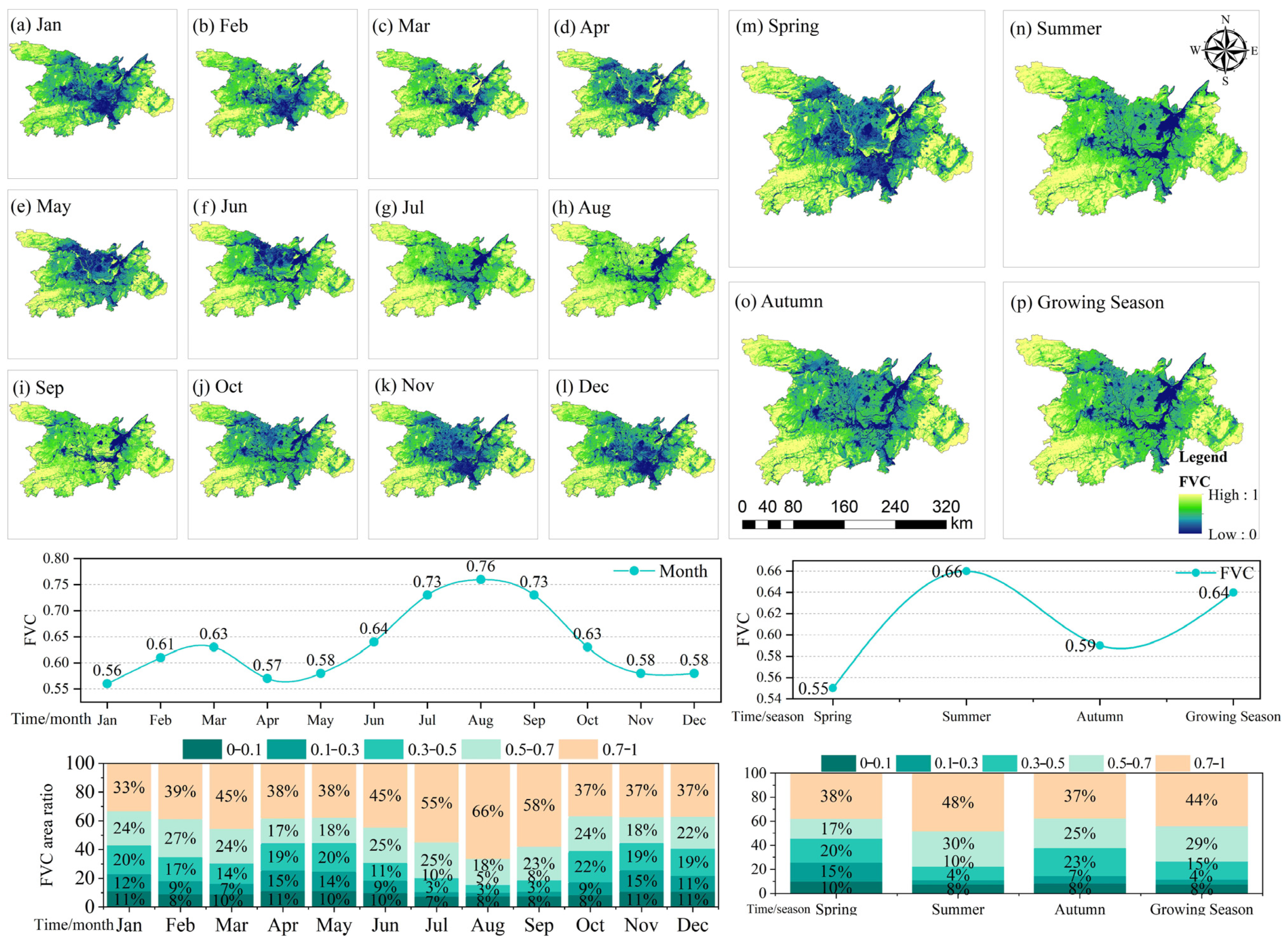 - In 2011, vegetation was in a relatively poor state with the lowest average FVC (0.6) and a low proportion of high-coverage areas. In contrast, 2005, 2010, and 2012 had good vegetation conditions, high average FVC (0.65), and a high proportion of high-coverage areas. Vegetation growth was best in summer (July–September), with high average FVC and a large proportion of high-coverage areas, while it was relatively poor in other months.