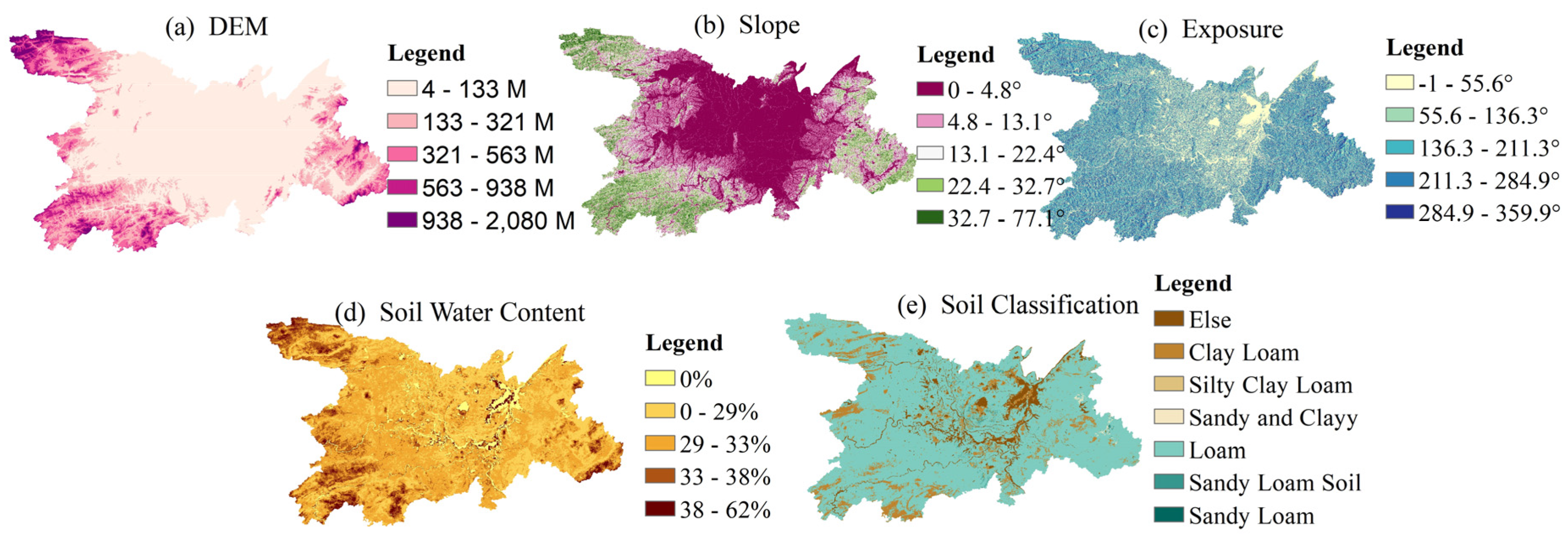 - Majeed, M.; Tariq, A.; Anwar, M.M.; Khan, A.M.; Arshad, F.; Mumtaz, F.; Farhan, M.; Zhang, L.; Zafar, A.; Aziz, M. Monitoring of land use–land cover change and potential causal factors of climate change in Jhelum district, Punjab, Pakistan, through GIS and multi-temporal satellite data. Land 2021, 10, 1026. [Google Scholar] [CrossRef]