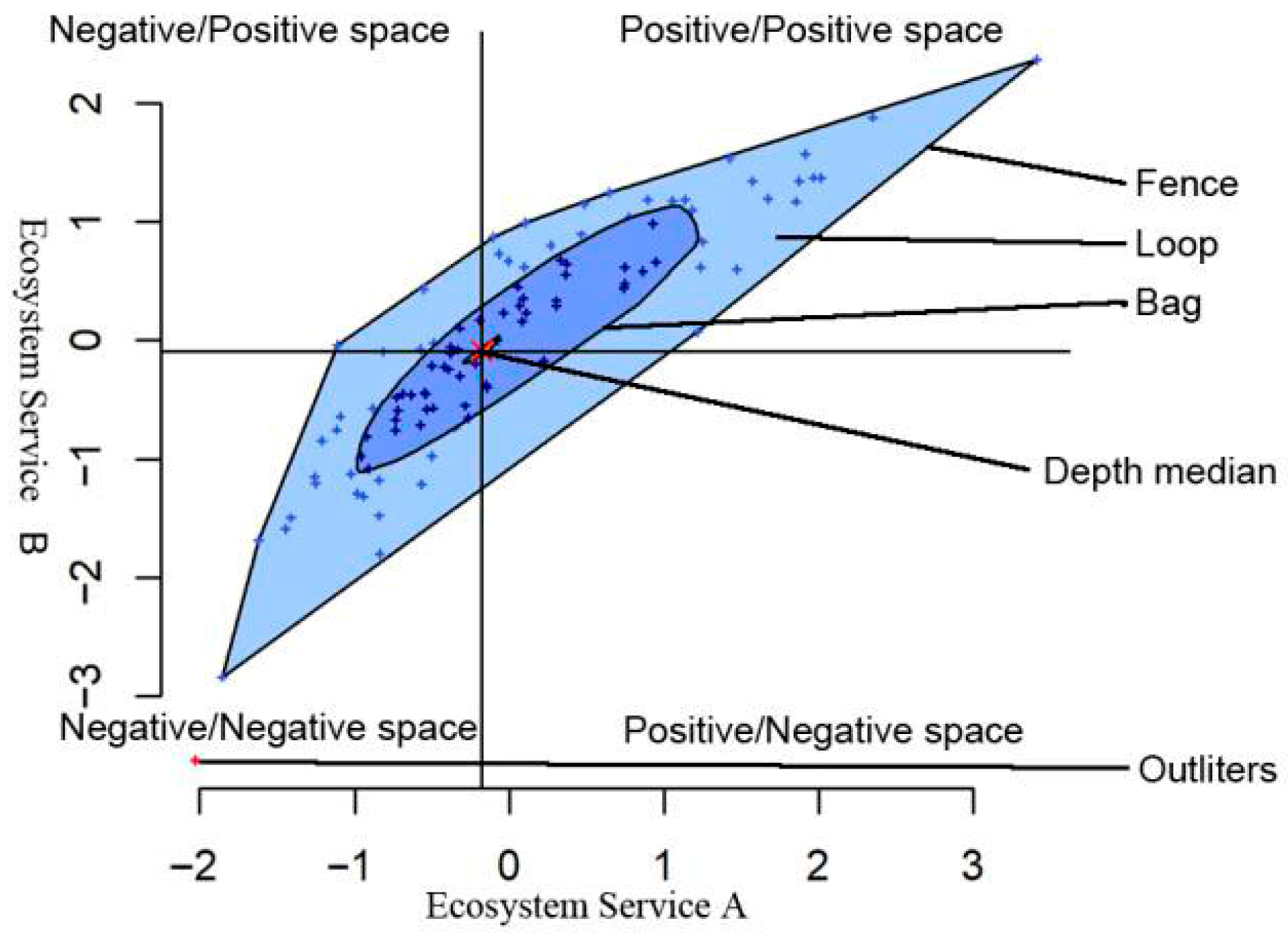Figure 2). Each quadrant represents the likelihood space of the relationship between ecosystem services A and B. The positive/positive space (two ecosystem services performing well relative to the depth median) is located in the upper-right corner of the depth median, and the negative/negative space is located in the lower-left corner. Bagplots were computationally mapped using the R language bagplot package by applying an improved normal distribution and standardized ecosystem service values.