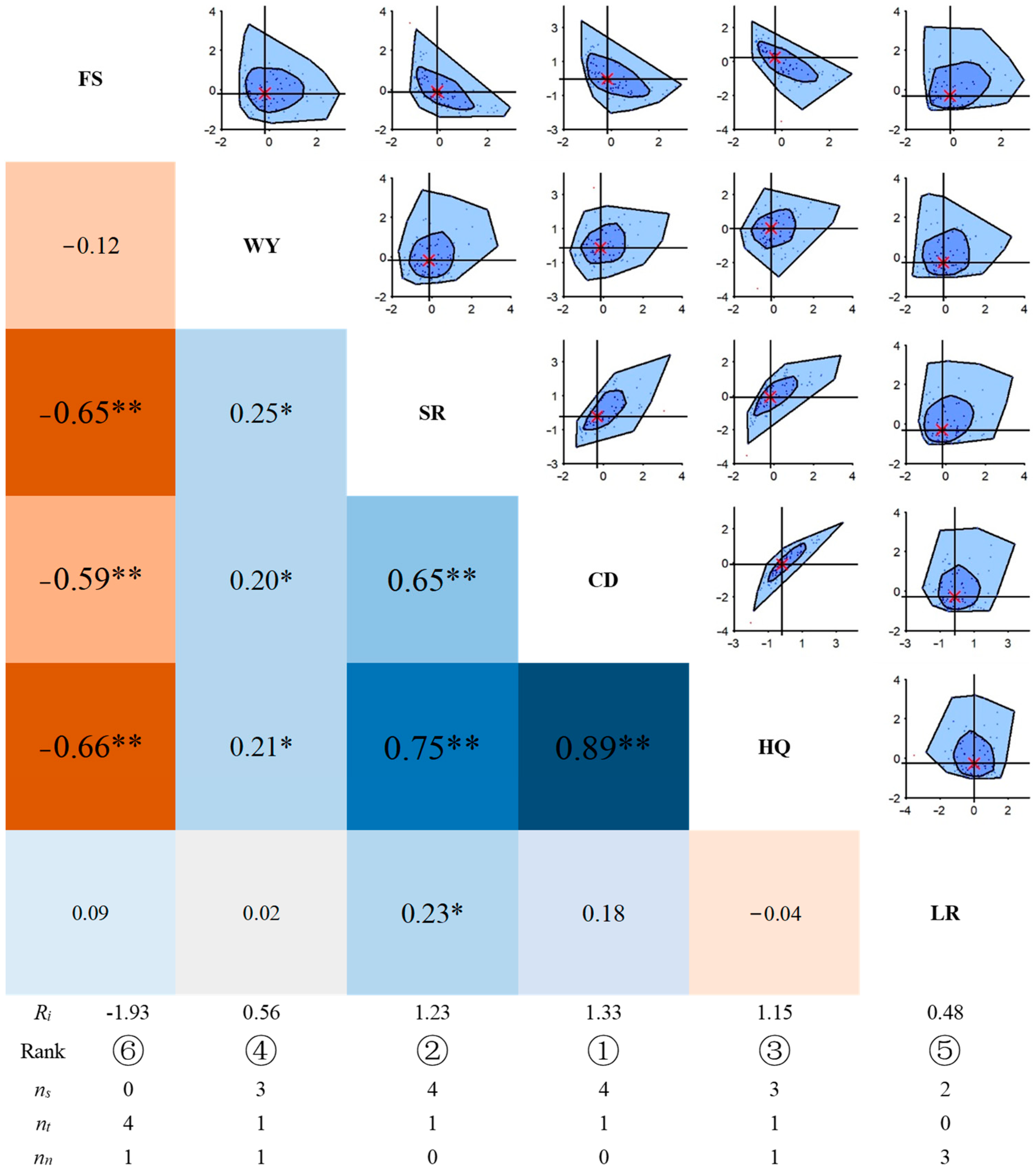 Three ecosystem service pairs showed compatible relationships, with r values close to 0, namely FS vs. LR (r = 0.09), WY vs. LR (r = 0.02), and HQ vs. LR (r = −0.04). The shape distribution of the pocket diagram was asymmetrical, mainly covering positive/positive and negative/positive spaces. Positive/negative and negative/negative spaces covered less area, and although the area distribution was not balanced, the pocket diagram direction extension was not obvious, and it still showed a compatible relationship in general.