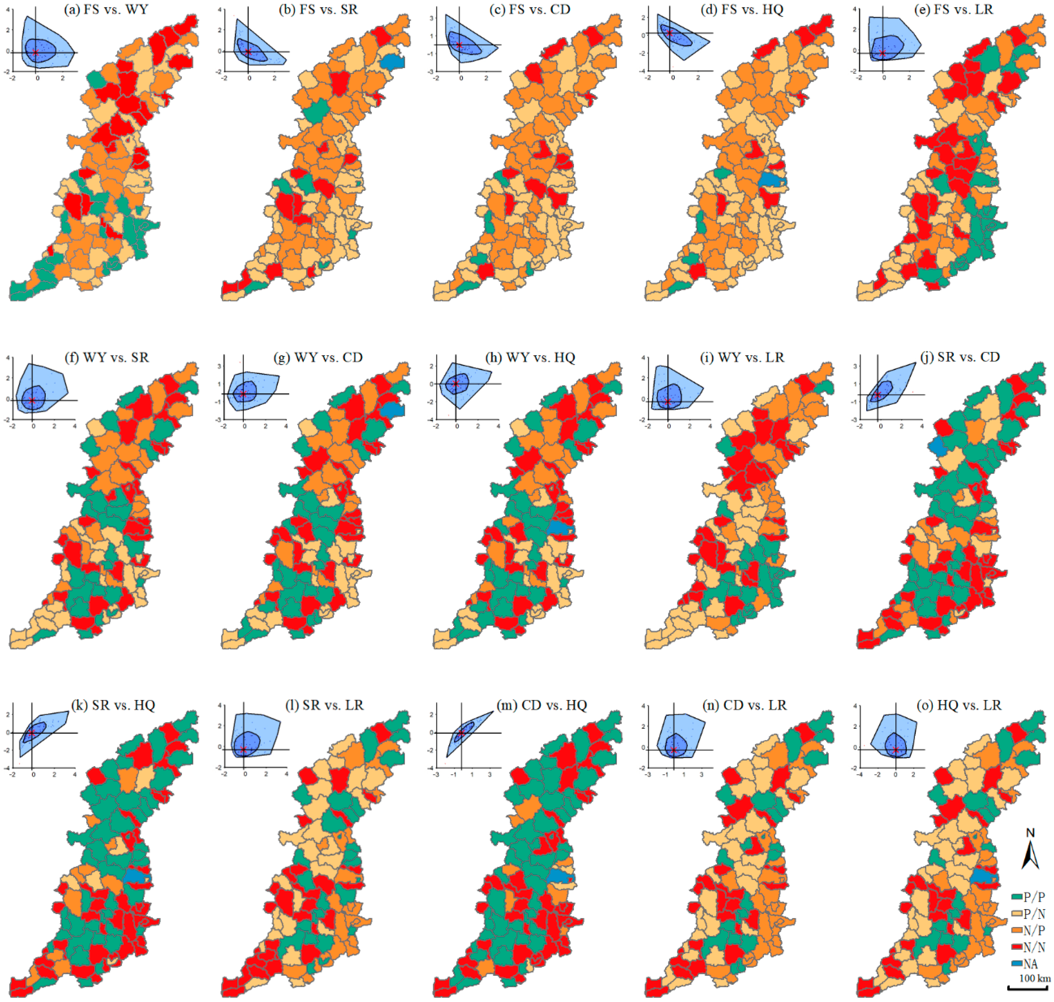 Figure 4 (P/P, P/N, N/P, N/N) is determined based on the positions of the county’s values for the two services relative to the bagplot depth median point constructed for all sample points in the service pair. Specifically, P indicates a value above the median depth value for that service, while N indicates a value below it. Therefore, P/P is located in the first quadrant of the bagplot (filled in green), P/N is in the second quadrant (filled in light orange), N/N is in the third quadrant (filled in red), N/P is in the fourth quadrant (filled in dark orange), and NA corresponds to outliers outside the fence. Our findings revealed distinct patterns of synergistic and trade-off relationships among the ecosystem service pairs. Specifically, FS and WY exhibited synergistic relationships in 48 counties with equal proportions of positive–positive and negative–negative synergies (24 counties each). These spatial clusters demonstrated clear geographical segregation. The positive–positive synergies predominantly concentrated in the southern counties, such as Yongji, Ruicheng etal, which are characterized by higher precipitation and more intensive agricultural practices, suggesting that under certain conditions, agricultural development and water yield can coexist. The negative–negative synergies clustered in the northern counties. This spatial dichotomy suggests better synergistic effects between food provisioning and water production services in the southern Taihang Mountains than in the northern regions. Conversely, trade-off relationships between FS and WY were observed in 53 counties, showing differential spatial aggregation patterns: negative-positive trade-offs (27 counties) formed concentrated clusters in the central-southern regions, while positive-negative trade-offs (26 counties) displayed dispersed distributions (
